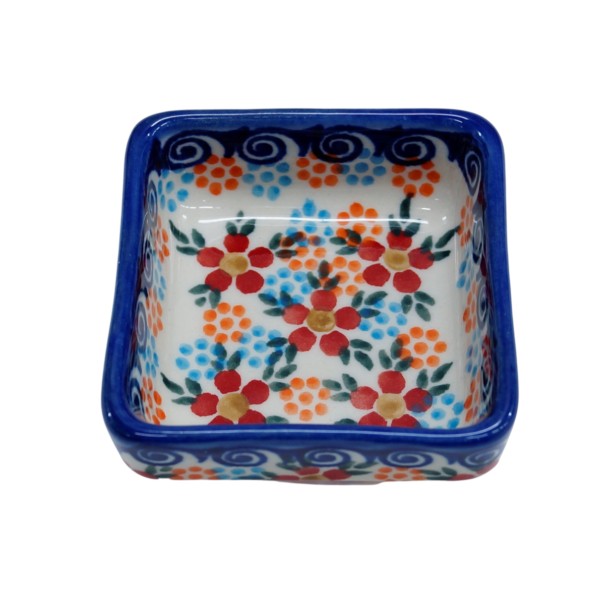 Oryginalny produkt ceramiki bolesławieckiej - miseczka kwadratowa na sos 1, o pojemności 35 ml, idealna do podawania i przechowywania wszelkich rodzajów sosów (sos czosnkowy, ziołowy, majonez czy ketchup).