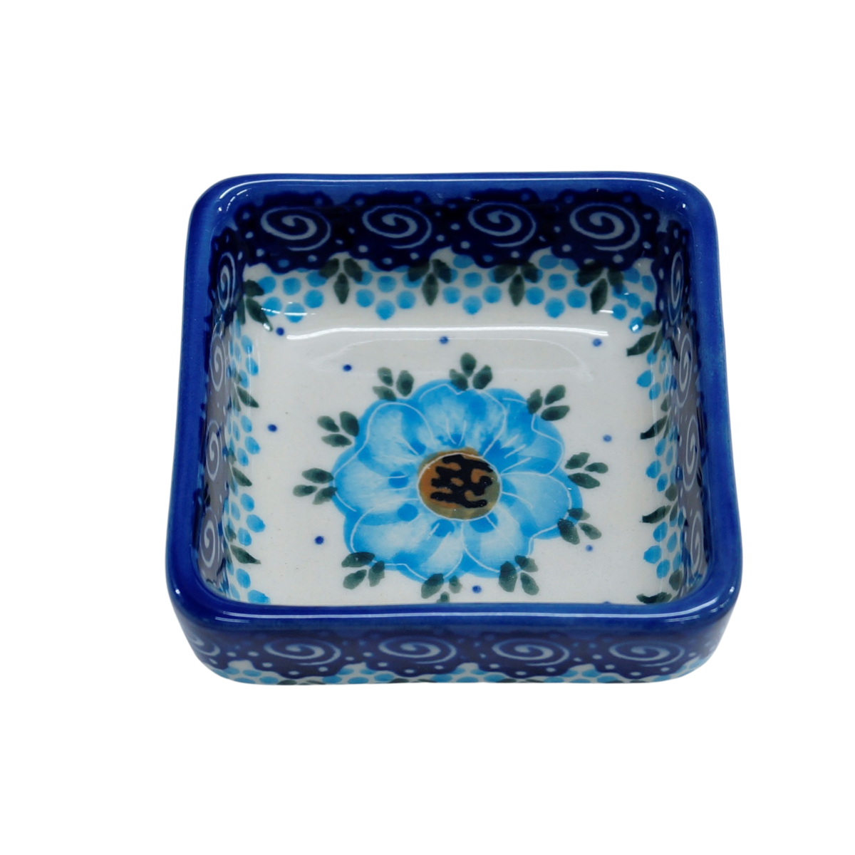 Oryginalny produkt ceramiki bolesławieckiej - miseczka kwadratowa na sos 1, o pojemności 35 ml, idealna do podawania i przechowywania wszelkich rodzajów sosów (sos czosnkowy, ziołowy, majonez czy ketchup).