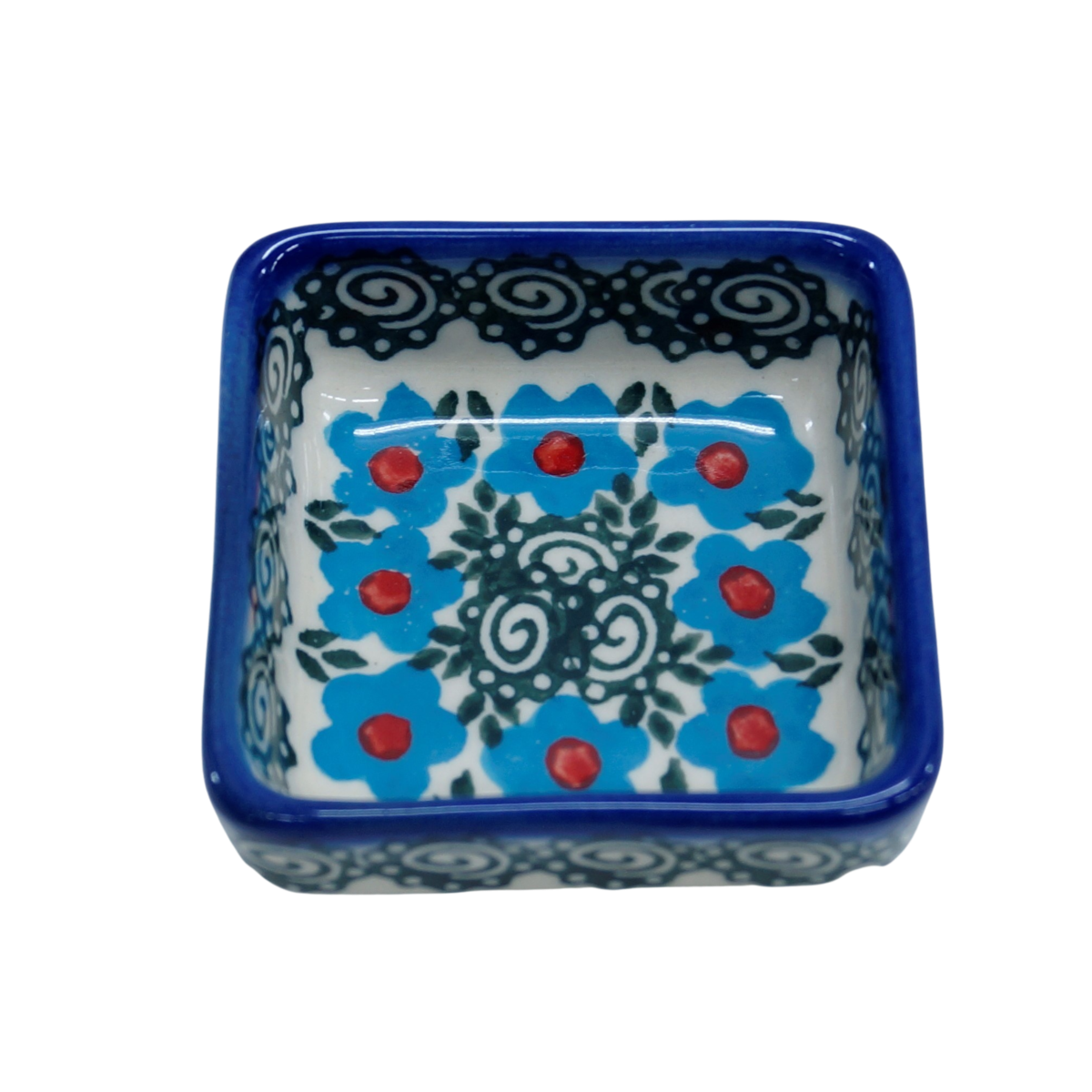 Oryginalny produkt ceramiki bolesławieckiej - miseczka kwadratowa na sos 1, o pojemności 35 ml, idealna do podawania i przechowywania wszelkich rodzajów sosów (sos czosnkowy, ziołowy, majonez czy ketchup).