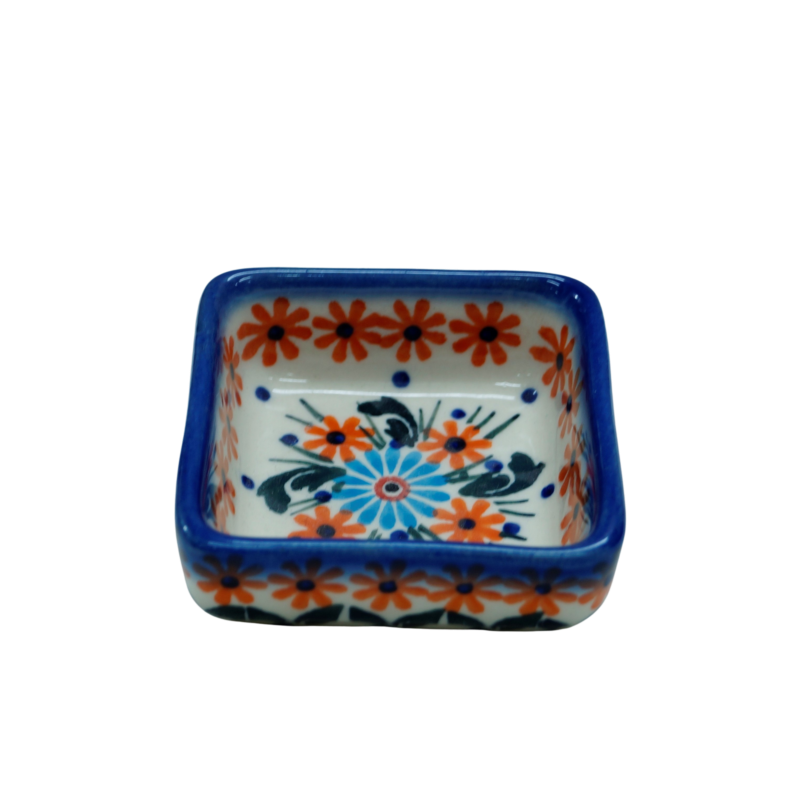 Oryginalny produkt ceramiki bolesławieckiej - miseczka kwadratowa na sos 1, o pojemności 35 ml, idealna do podawania i przechowywania wszelkich rodzajów sosów (sos czosnkowy, ziołowy, majonez czy ketchup).