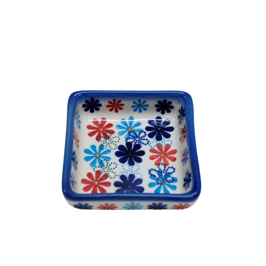 Oryginalny produkt ceramiki bolesławieckiej - miseczka kwadratowa na sos 2, o pojemności 75 ml, , idealna do podawania i przechowywania wszelkich rodzajów sosów (sos czosnkowy, ziołowy, majonez czy ketchup).