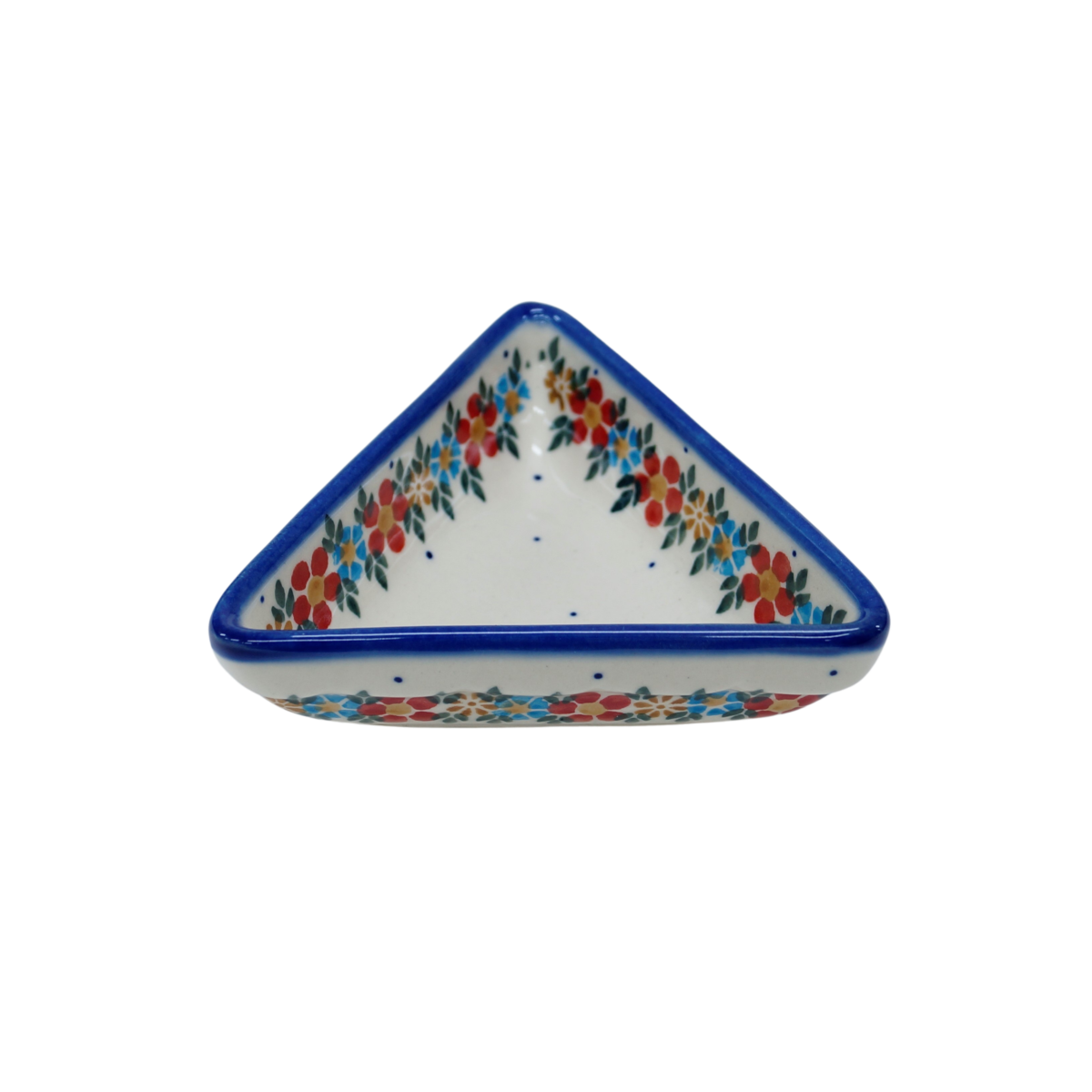 Oryginalny produkt ceramiki bolesławieckiej - miseczka trójkątna mała, idealna do podawania i przechowywania potraw. Niech Twoja potrawa będzie podana pięknie i smakuje wykwitnie dzięki artystycznym naczyniom ceramiki Bolesławieckiej z rodzinnej manufaktury, CERAMIKA ANDY.