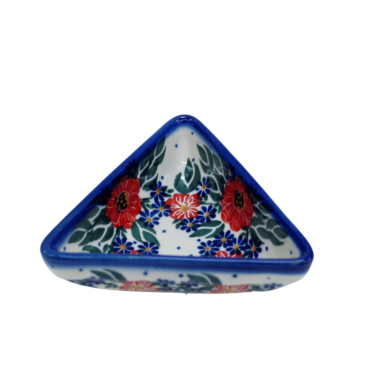Oryginalny produkt ceramiki bolesławieckiej - miseczka trójkątna mała, idealna do podawania i przechowywania potraw. Niech Twoja potrawa będzie podana pięknie i smakuje wykwitnie dzięki artystycznym naczyniom ceramiki Bolesławieckiej z rodzinnej manufaktury, CERAMIKA ANDY.