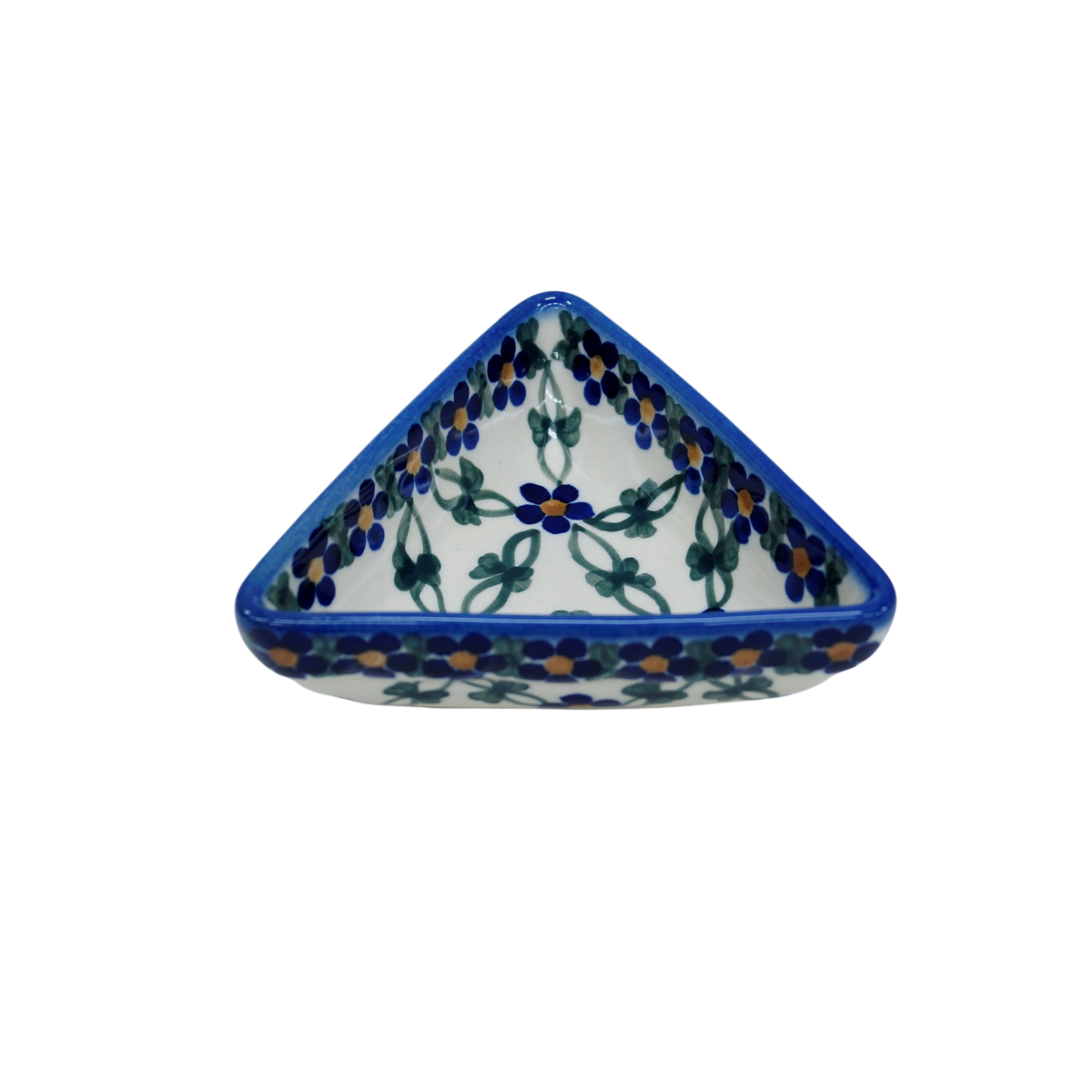 Oryginalny produkt ceramiki bolesławieckiej - miseczka trójkątna mała, idealna do podawania i przechowywania potraw. Niech Twoja potrawa będzie podana pięknie i smakuje wykwitnie dzięki artystycznym naczyniom ceramiki Bolesławieckiej z rodzinnej manufaktury, CERAMIKA ANDY.