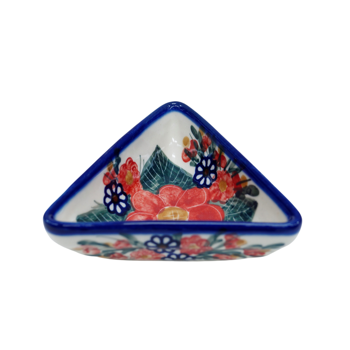 Oryginalny produkt ceramiki bolesławieckiej - miseczka trójkątna mała, idealna do podawania i przechowywania potraw. Niech Twoja potrawa będzie podana pięknie i smakuje wykwitnie dzięki artystycznym naczyniom ceramiki Bolesławieckiej z rodzinnej manufaktury, CERAMIKA ANDY.