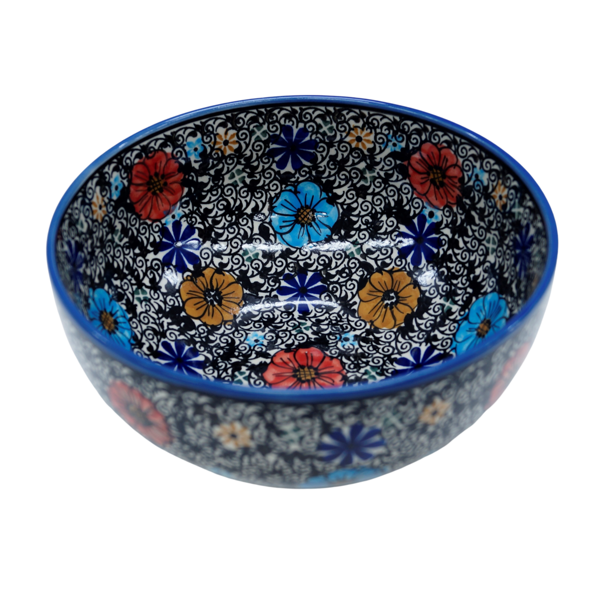Oryginalny produkt ceramiki bolesławieckiej - ręcznie zdobiona miska ceramiczna 20 cm o średnicy zewnętrznej aż 21,5 cm, idealna do podawania i przechowywania potraw. Niech wszystkie potrawy i posiłki będą podane pięknie i smakują wykwitnie dzięki artystycznym naczyniom ceramiki Bolesławieckiej z rodzinnej manufaktury, CERAMIKA ANDY.