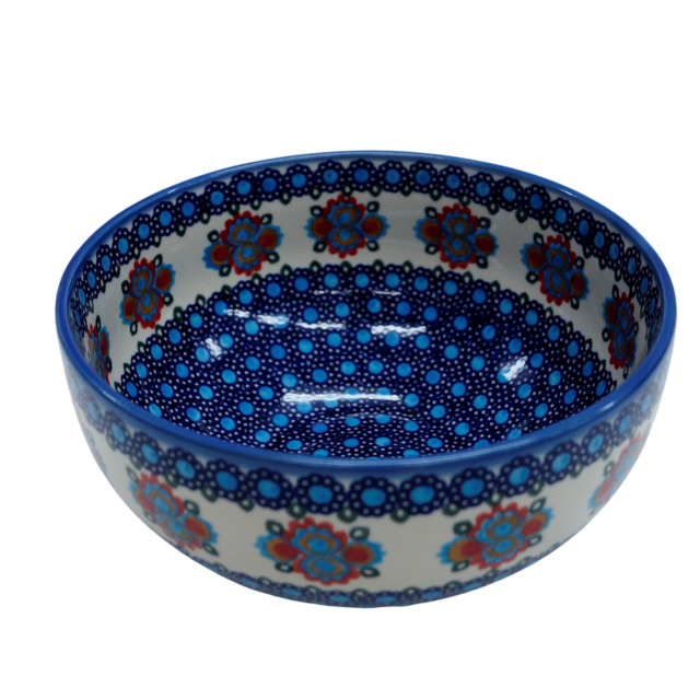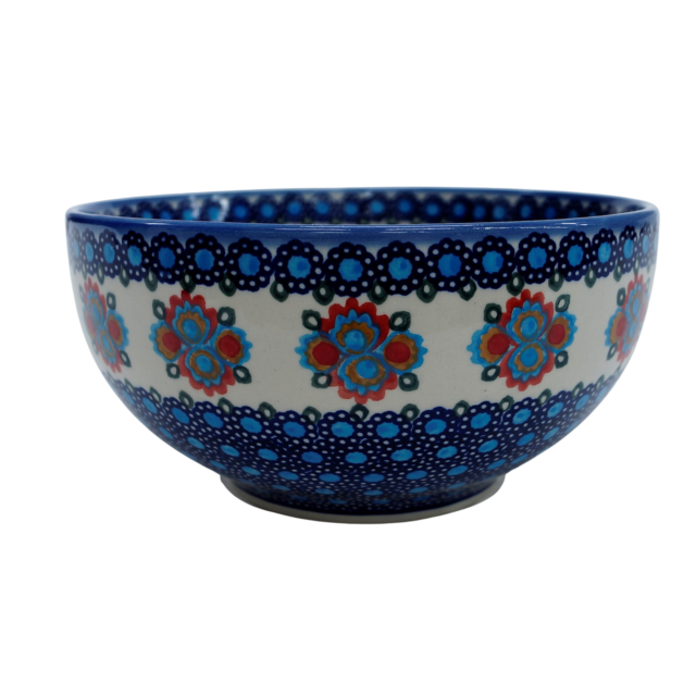 Oryginalny produkt ceramiki bolesławieckiej - ręcznie zdobiona miska ceramiczna 20 cm o średnicy zewnętrznej aż 21,5 cm, idealna do podawania i przechowywania potraw. Niech wszystkie potrawy i posiłki będą podane pięknie i smakują wykwitnie dzięki artystycznym naczyniom ceramiki Bolesławieckiej z rodzinnej manufaktury, CERAMIKA ANDY.