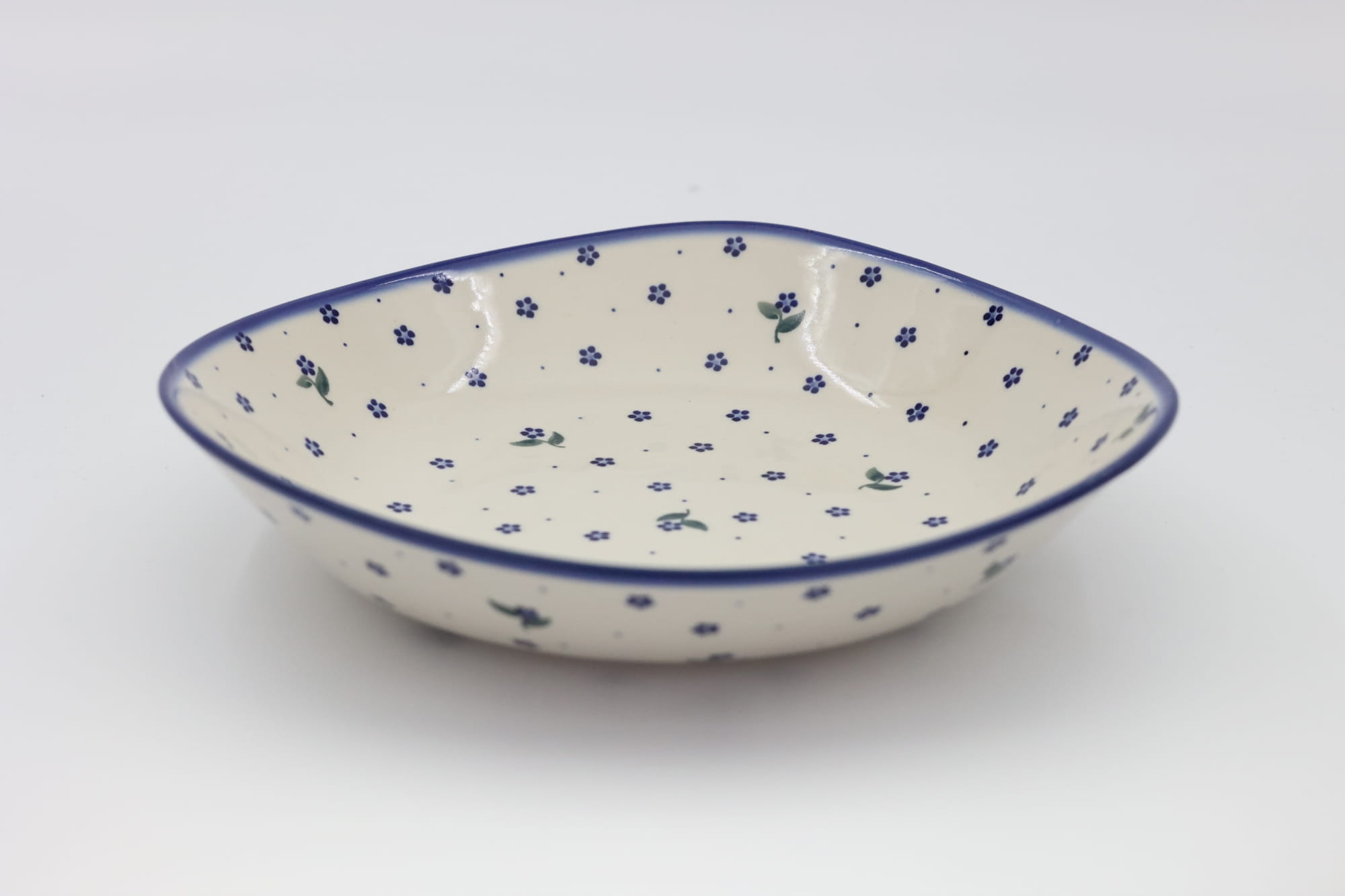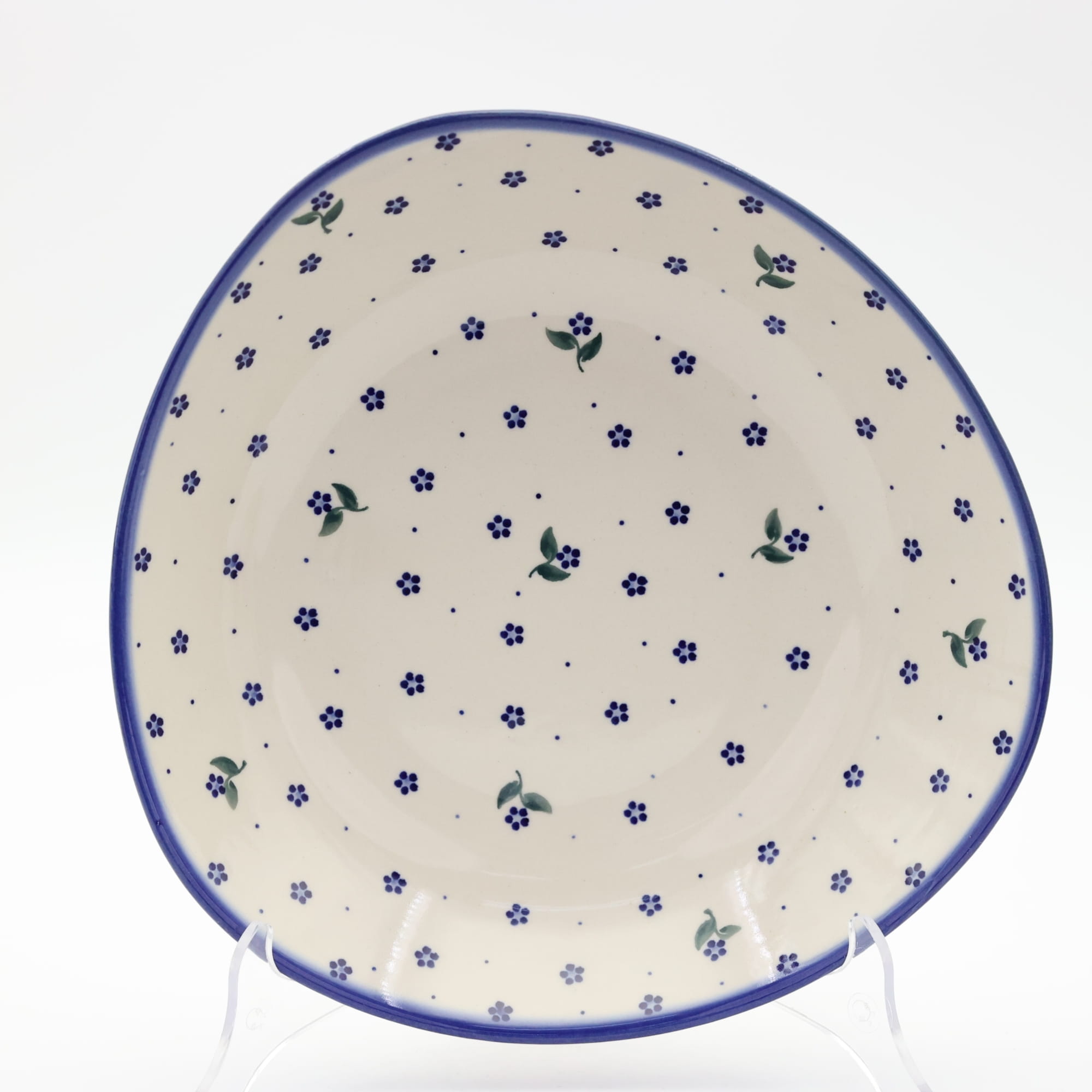 Oryginalny produkt ceramiki bolesławieckiej - miska ceramiczna Nina o szerokości 28 cm i pojemności 1200 ml. Ręcznie zdobiona kamionkowa misa o nie regularnym kształcie, idealna do podawania i przechowywania potraw. Niech Twoja potrawa przygotowana będzie podana pięknie i smakuje wykwitnie dzięki artystycznym naczyniom ceramiki Bolesławieckiej z rodzinnej manufaktury, CERAMIKA ANDY, ręcznie zdobionym podszkliwnie.