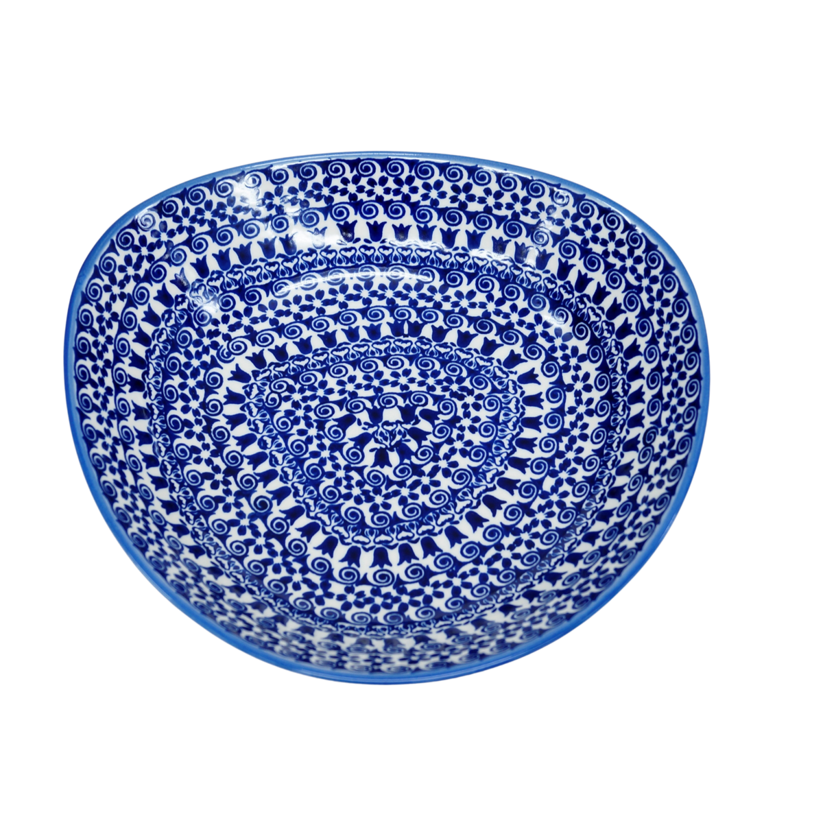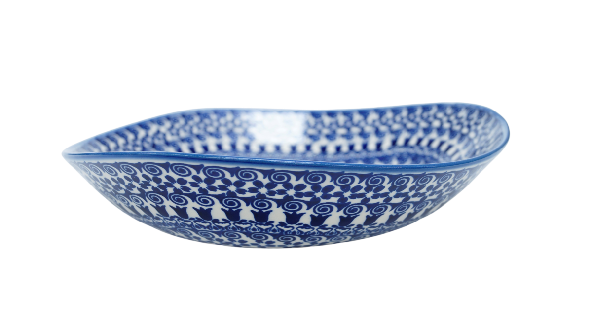 Oryginalny produkt ceramiki bolesławieckiej - miska ceramiczna Nina o szerokości 28 cm i pojemności 1200 ml. Ręcznie zdobiona kamionkowa misa o nie regularnym kształcie, idealna do podawania i przechowywania potraw. Niech Twoja potrawa przygotowana będzie podana pięknie i smakuje wykwitnie dzięki artystycznym naczyniom ceramiki Bolesławieckiej z rodzinnej manufaktury, CERAMIKA ANDY, ręcznie zdobionym podszkliwnie.
