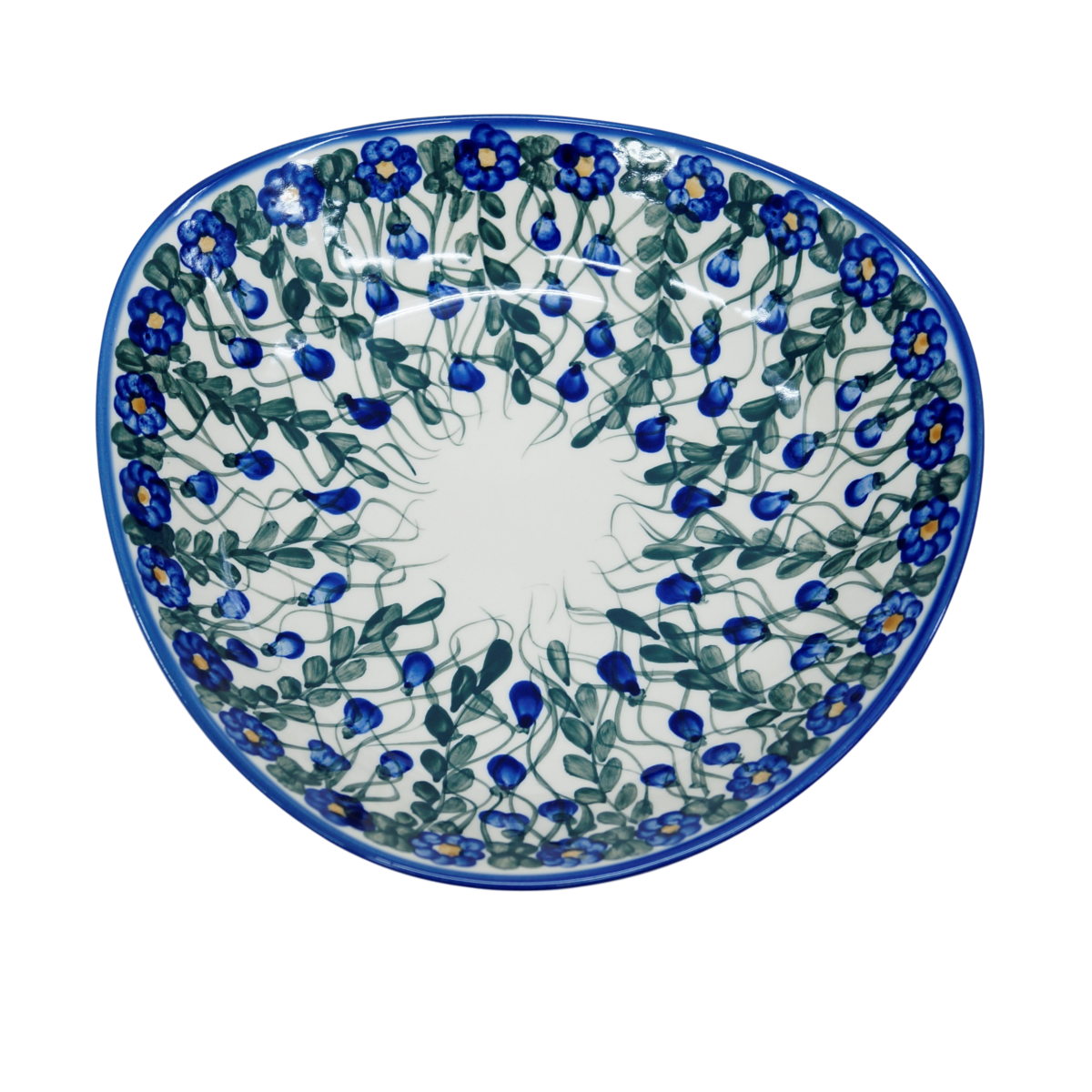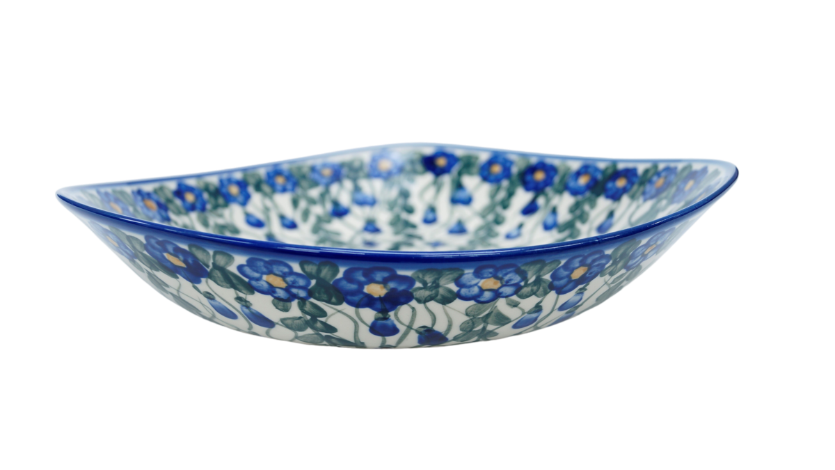 Oryginalny produkt ceramiki bolesławieckiej - miska ceramiczna Nina o szerokości 28 cm i pojemności 1200 ml. Ręcznie zdobiona kamionkowa misa o nie regularnym kształcie, idealna do podawania i przechowywania potraw. Niech Twoja potrawa przygotowana będzie podana pięknie i smakuje wykwitnie dzięki artystycznym naczyniom ceramiki Bolesławieckiej z rodzinnej manufaktury, CERAMIKA ANDY, ręcznie zdobionym podszkliwnie.