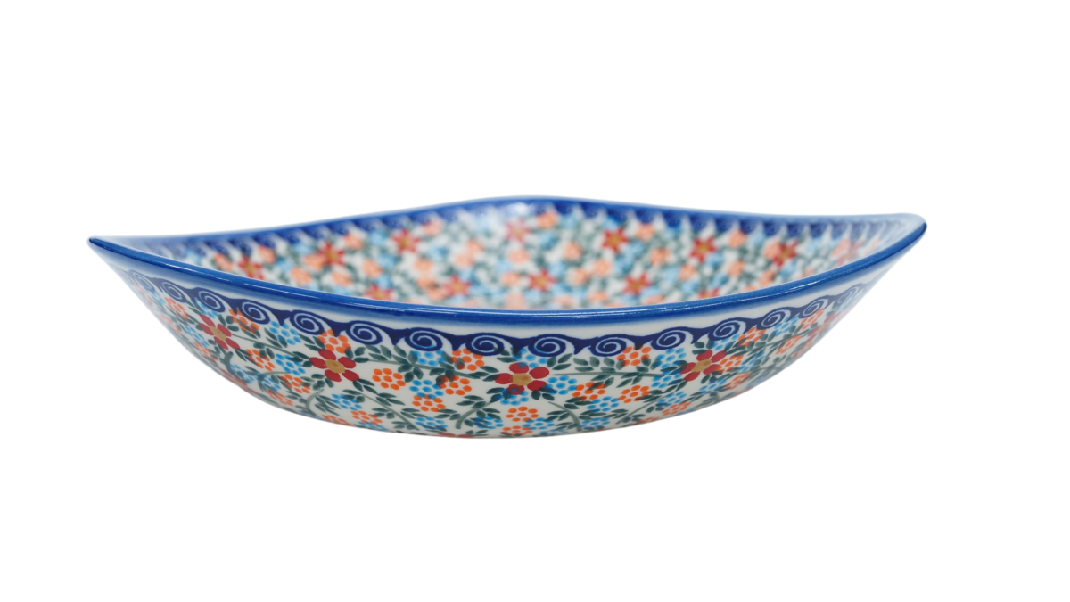 Oryginalny produkt ceramiki bolesławieckiej - miska ceramiczna Nina o szerokości 28 cm i pojemności 1200 ml. Ręcznie zdobiona kamionkowa misa o nie regularnym kształcie, idealna do podawania i przechowywania potraw. Niech Twoja potrawa przygotowana będzie podana pięknie i smakuje wykwitnie dzięki artystycznym naczyniom ceramiki Bolesławieckiej z rodzinnej manufaktury, CERAMIKA ANDY, ręcznie zdobionym podszkliwnie.