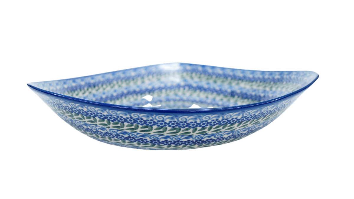 Oryginalny produkt ceramiki bolesławieckiej - miska ceramiczna Nina o szerokości 28 cm i pojemności 1200 ml. Ręcznie zdobiona kamionkowa misa o nie regularnym kształcie, idealna do podawania i przechowywania potraw. Niech Twoja potrawa przygotowana będzie podana pięknie i smakuje wykwitnie dzięki artystycznym naczyniom ceramiki Bolesławieckiej z rodzinnej manufaktury, CERAMIKA ANDY, ręcznie zdobionym podszkliwnie.