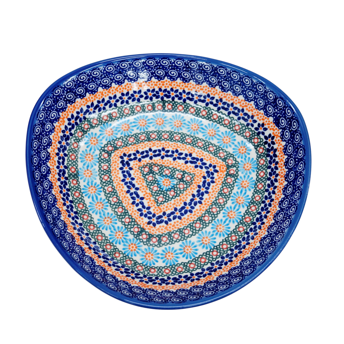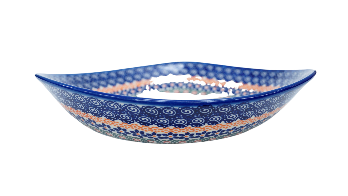 Oryginalny produkt ceramiki bolesławieckiej - miska ceramiczna Nina o szerokości 28 cm i pojemności 1200 ml. Ręcznie zdobiona kamionkowa misa o nie regularnym kształcie, idealna do podawania i przechowywania potraw. Niech Twoja potrawa przygotowana będzie podana pięknie i smakuje wykwitnie dzięki artystycznym naczyniom ceramiki Bolesławieckiej z rodzinnej manufaktury, CERAMIKA ANDY, ręcznie zdobionym podszkliwnie.