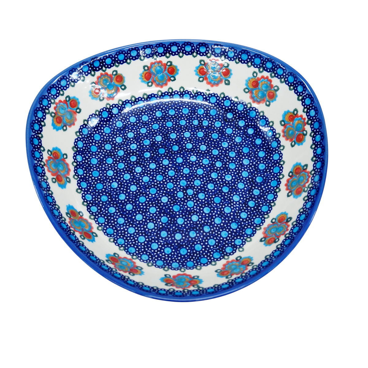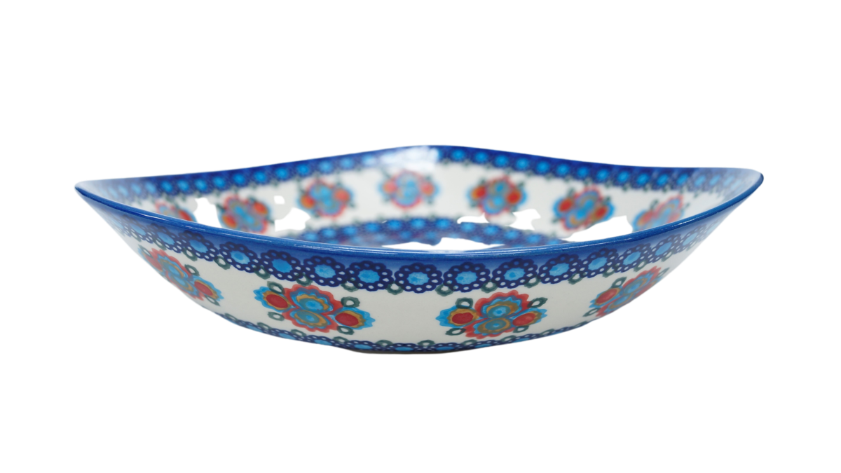 Oryginalny produkt ceramiki bolesławieckiej - miska ceramiczna Nina o szerokości 28 cm i pojemności 1200 ml. Ręcznie zdobiona kamionkowa misa o nie regularnym kształcie, idealna do podawania i przechowywania potraw. Niech Twoja potrawa przygotowana będzie podana pięknie i smakuje wykwitnie dzięki artystycznym naczyniom ceramiki Bolesławieckiej z rodzinnej manufaktury, CERAMIKA ANDY, ręcznie zdobionym podszkliwnie.
