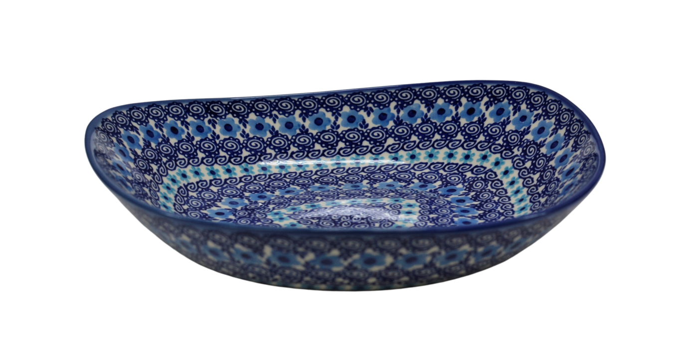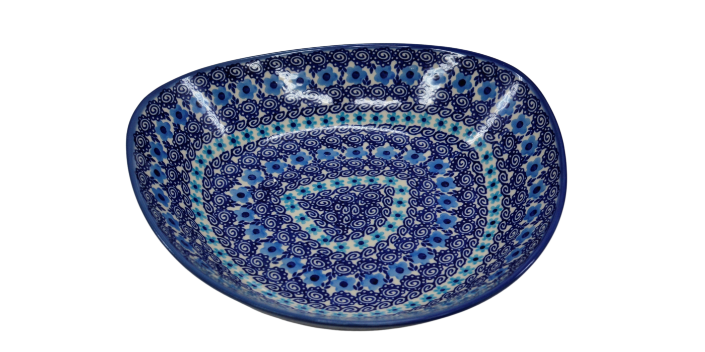 Oryginalny produkt ceramiki bolesławieckiej - miska ceramiczna Nina o szerokości 28 cm i pojemności 1200 ml. Ręcznie zdobiona kamionkowa misa o nie regularnym kształcie, idealna do podawania i przechowywania potraw. Niech Twoja potrawa przygotowana będzie podana pięknie i smakuje wykwitnie dzięki artystycznym naczyniom ceramiki Bolesławieckiej z rodzinnej manufaktury, CERAMIKA ANDY, ręcznie zdobionym podszkliwnie.