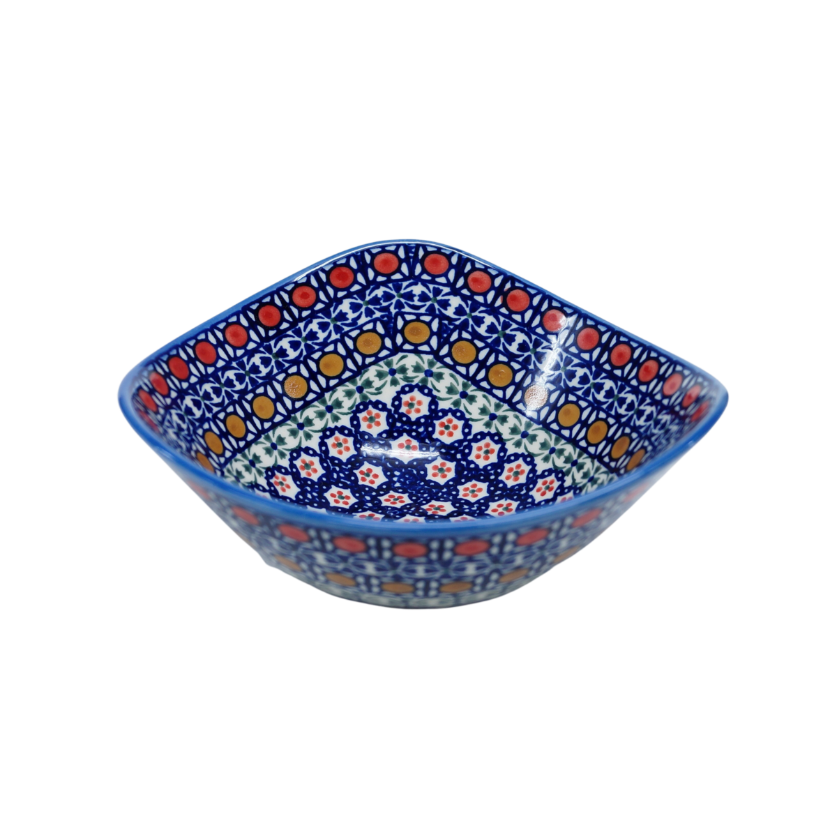 Ręcznie zdobiona kamionkowa misa o nie regularnym kształcie, idealna do podawania i przechowywania potraw. Niech Twoja potrawa przygotowana będzie podana pięknie i smakuje wykwitnie dzięki artystycznym naczyniom ceramiki Bolesławieckiej z rodzinnej manufaktury, CERAMIKA ANDY, ręcznie zdobionym podszkliwnie.