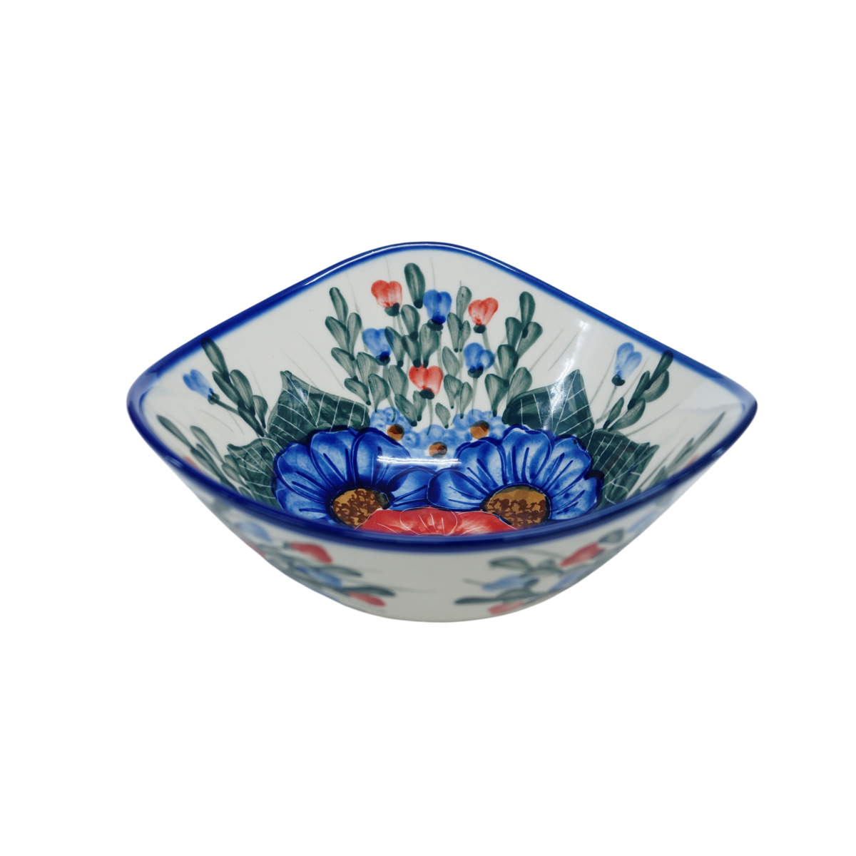 Ręcznie zdobiona kamionkowa misa o nie regularnym kształcie, idealna do podawania i przechowywania potraw. Niech Twoja potrawa przygotowana będzie podana pięknie i smakuje wykwitnie dzięki artystycznym naczyniom ceramiki Bolesławieckiej z rodzinnej manufaktury, CERAMIKA ANDY, ręcznie zdobionym podszkliwnie.