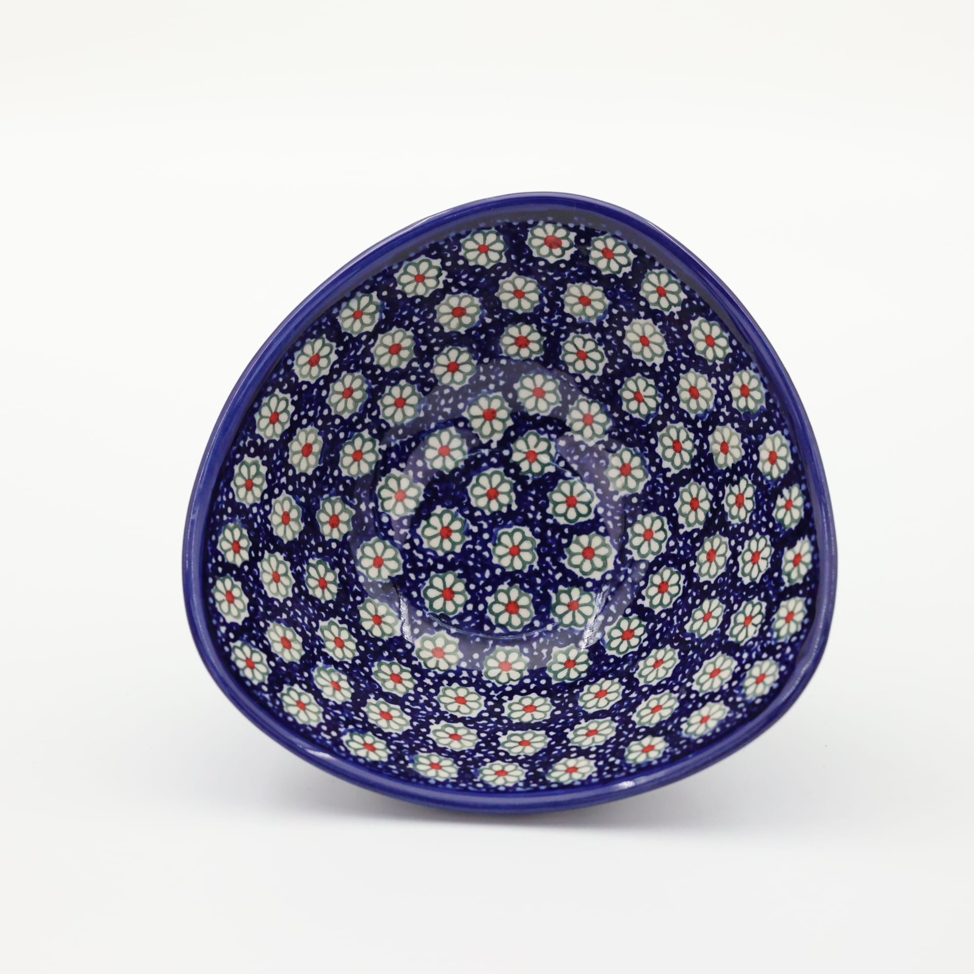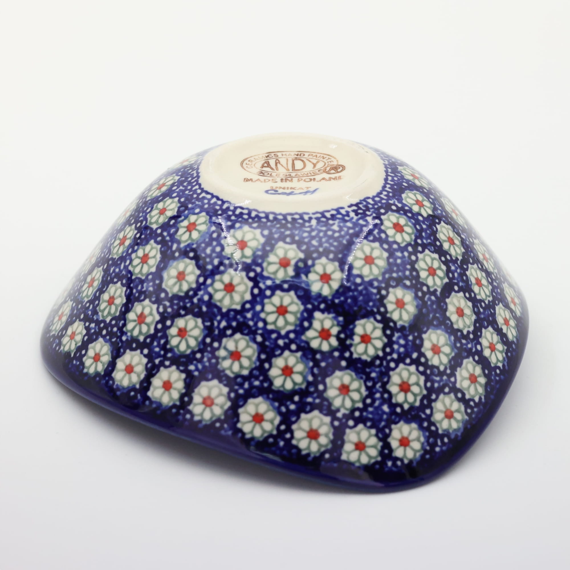 Ręcznie zdobiona kamionkowa misa o nie regularnym kształcie, idealna do podawania i przechowywania potraw. Niech Twoja potrawa przygotowana będzie podana pięknie i smakuje wykwitnie dzięki artystycznym naczyniom ceramiki Bolesławieckiej z rodzinnej manufaktury, CERAMIKA ANDY, ręcznie zdobionym podszkliwnie.