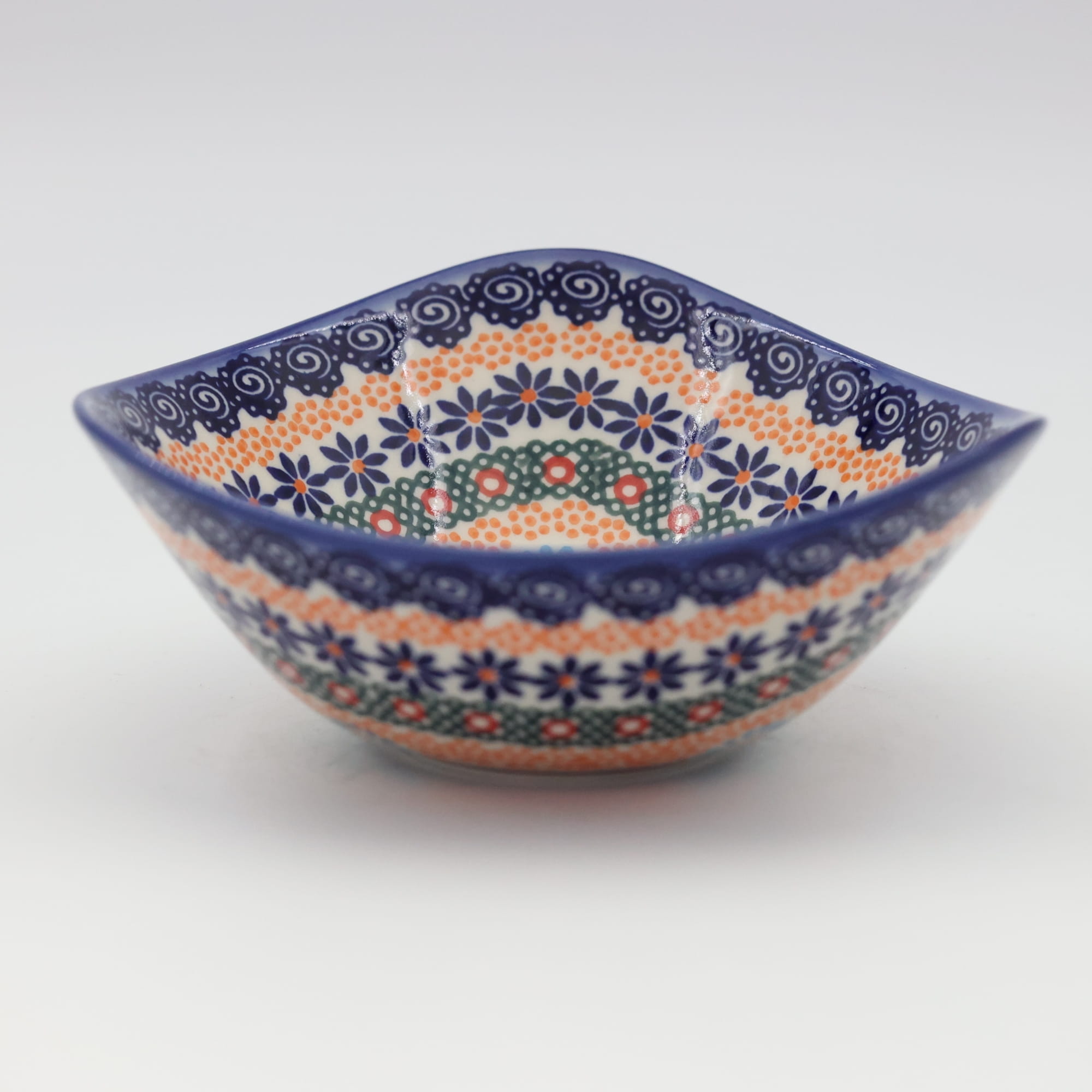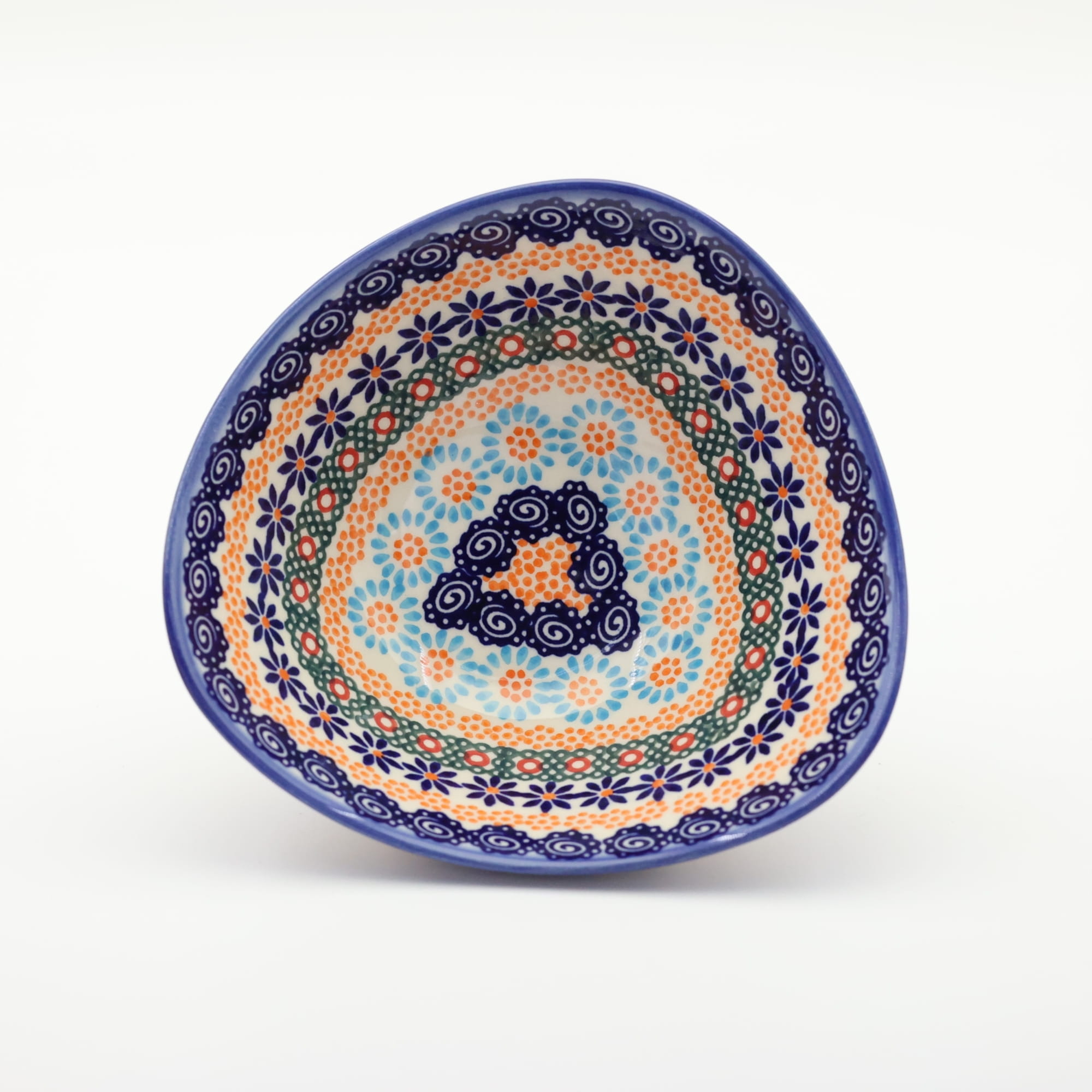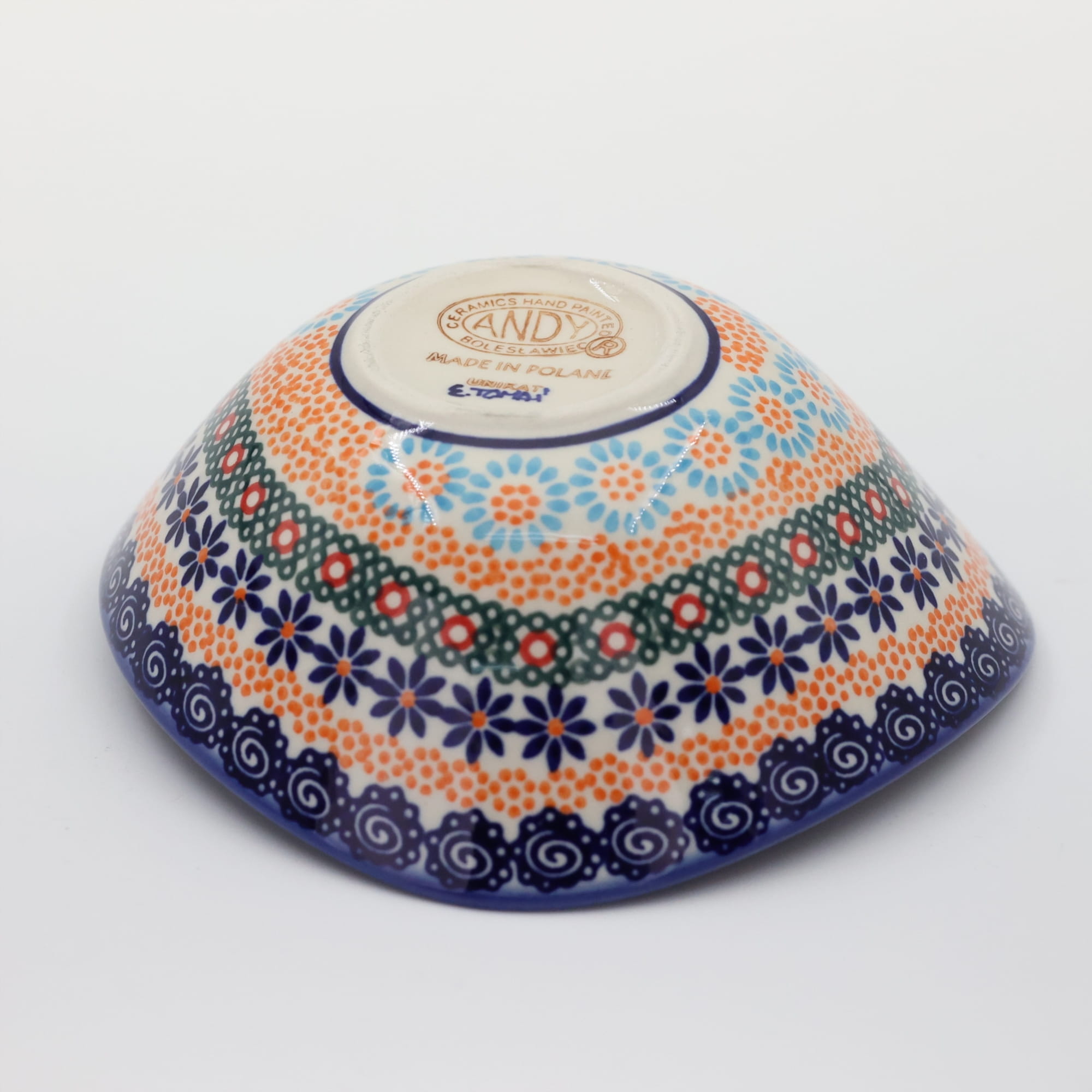 Ręcznie zdobiona kamionkowa misa o nie regularnym kształcie, idealna do podawania i przechowywania potraw. Niech Twoja potrawa przygotowana będzie podana pięknie i smakuje wykwitnie dzięki artystycznym naczyniom ceramiki Bolesławieckiej z rodzinnej manufaktury, CERAMIKA ANDY, ręcznie zdobionym podszkliwnie.