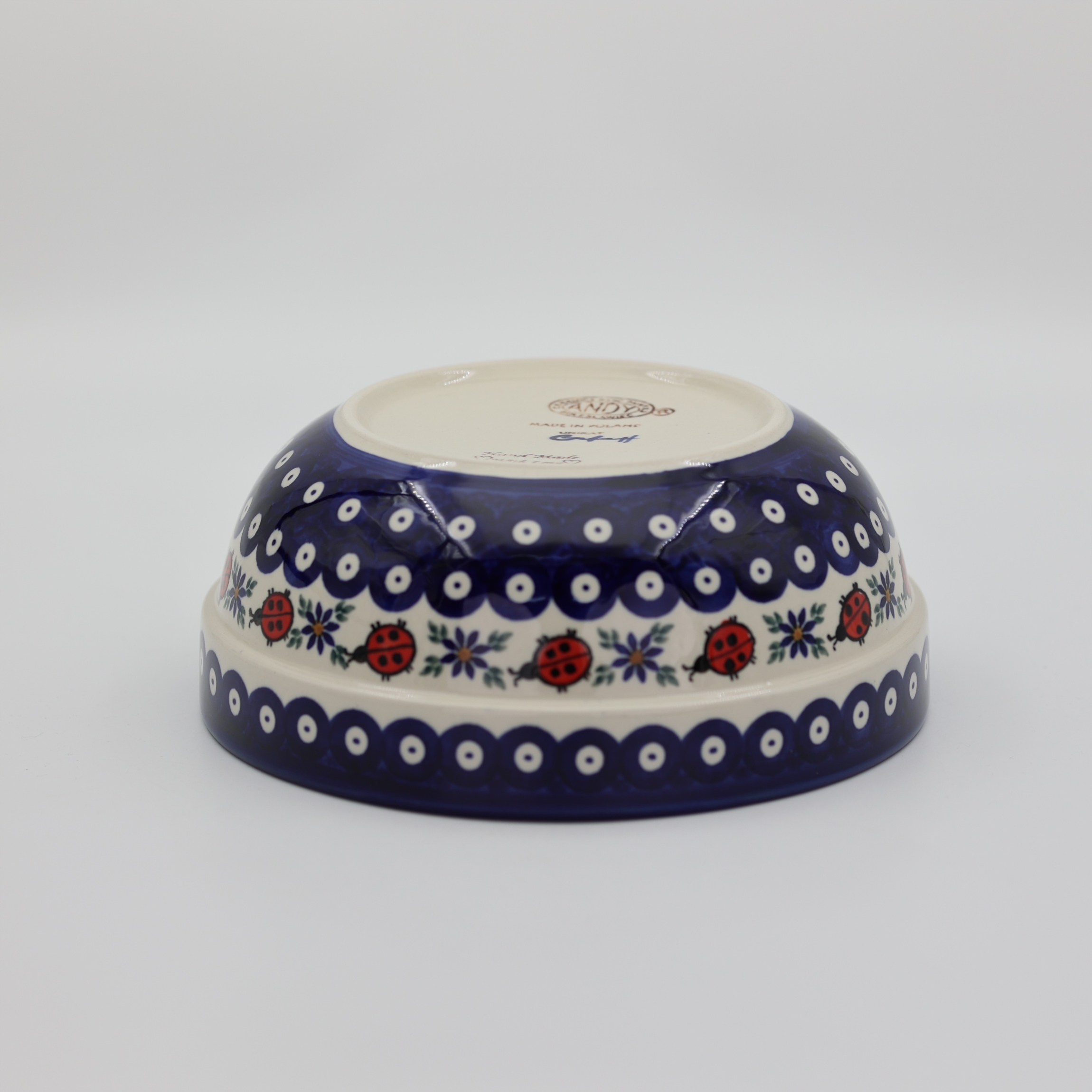 Oryginalny produkt ceramiki bolesławieckiej - miska ceramiczna z pięknym rantem zewnętrznym, salaterka o średnicy 23,3 cm z rantem, idealna do przygotowywania, podawania i przechowywania potraw. Niech Twoja potrawa będzie podana pięknie i smakuje wykwitnie dzięki artystycznym naczyniom ceramiki bolesławieckiej z rodzinnej manufaktury, CERAMIKA ANDY.