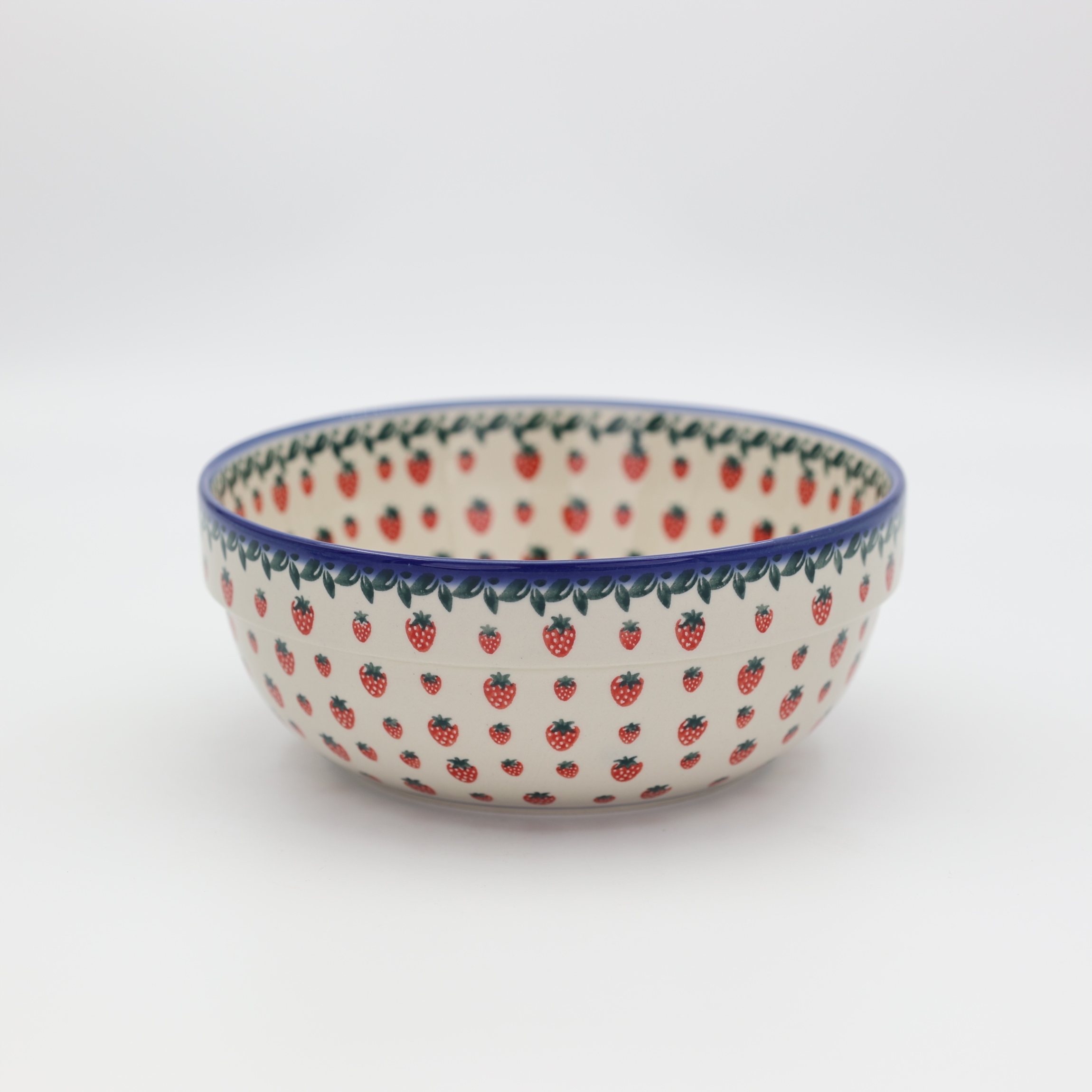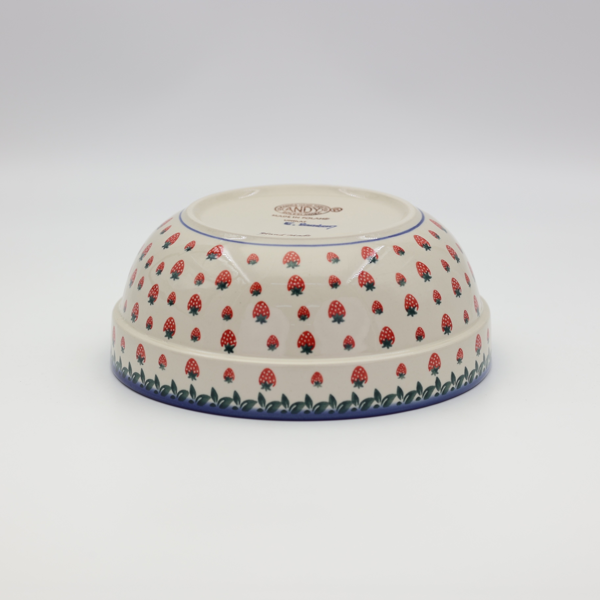 Oryginalny produkt ceramiki bolesławieckiej - miska ceramiczna z pięknym rantem zewnętrznym, salaterka o średnicy 23,3 cm z rantem, idealna do przygotowywania, podawania i przechowywania potraw. Niech Twoja potrawa będzie podana pięknie i smakuje wykwitnie dzięki artystycznym naczyniom ceramiki bolesławieckiej z rodzinnej manufaktury, CERAMIKA ANDY.
