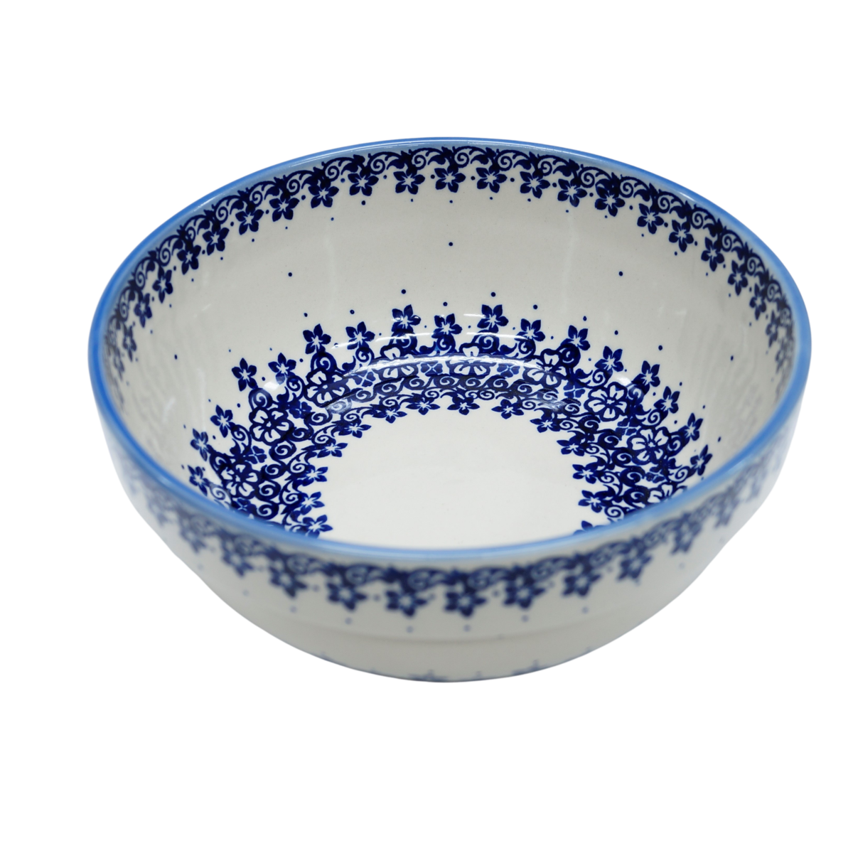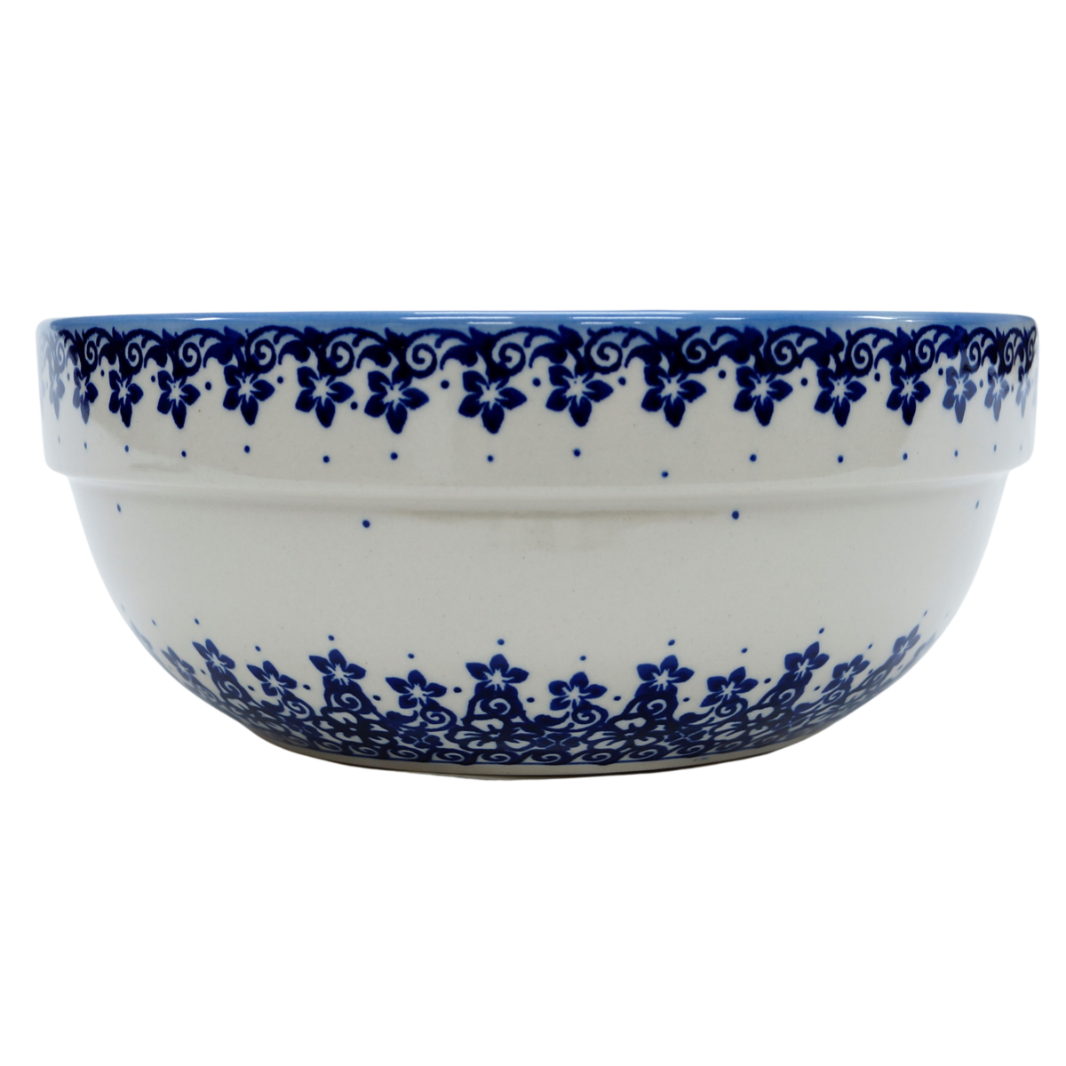 Oryginalny produkt ceramiki bolesławieckiej - miska ceramiczna z pięknym rantem zewnętrznym, salaterka o średnicy 23,3 cm z rantem, idealna do przygotowywania, podawania i przechowywania potraw. Niech Twoja potrawa będzie podana pięknie i smakuje wykwitnie dzięki artystycznym naczyniom ceramiki bolesławieckiej z rodzinnej manufaktury, CERAMIKA ANDY.