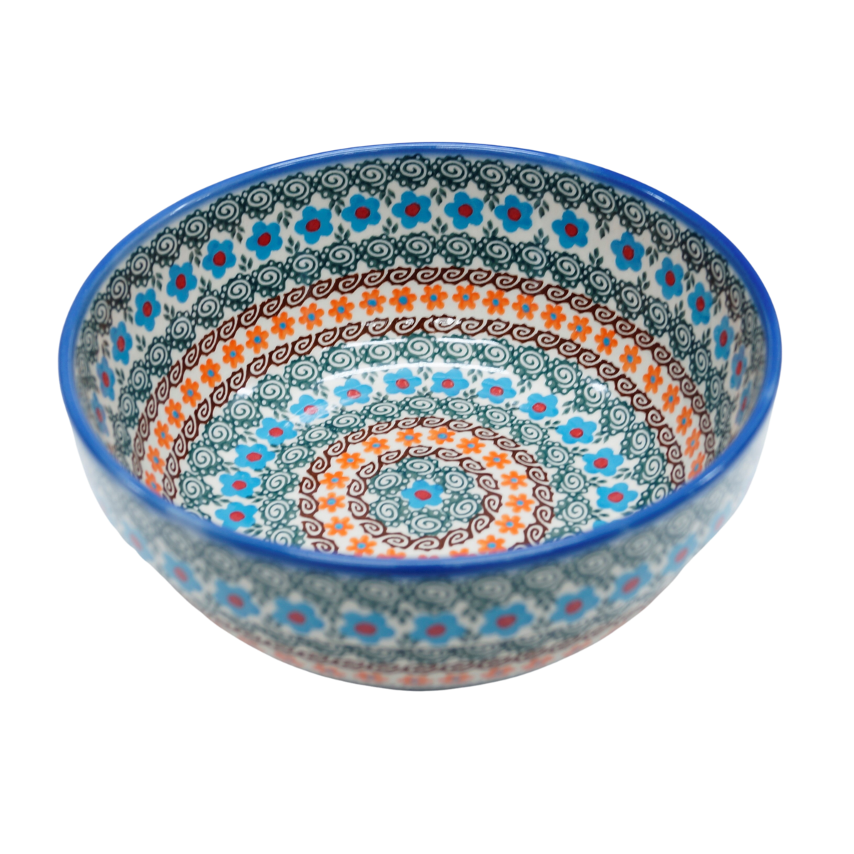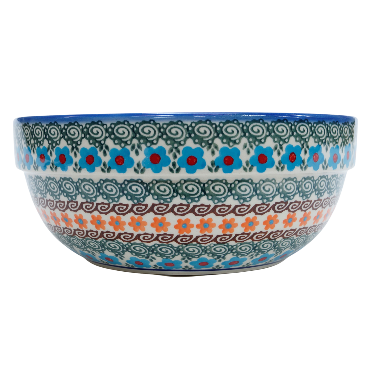 Oryginalny produkt ceramiki bolesławieckiej - miska ceramiczna z pięknym rantem zewnętrznym, salaterka o średnicy 23,3 cm z rantem, idealna do przygotowywania, podawania i przechowywania potraw. Niech Twoja potrawa będzie podana pięknie i smakuje wykwitnie dzięki artystycznym naczyniom ceramiki bolesławieckiej z rodzinnej manufaktury, CERAMIKA ANDY.