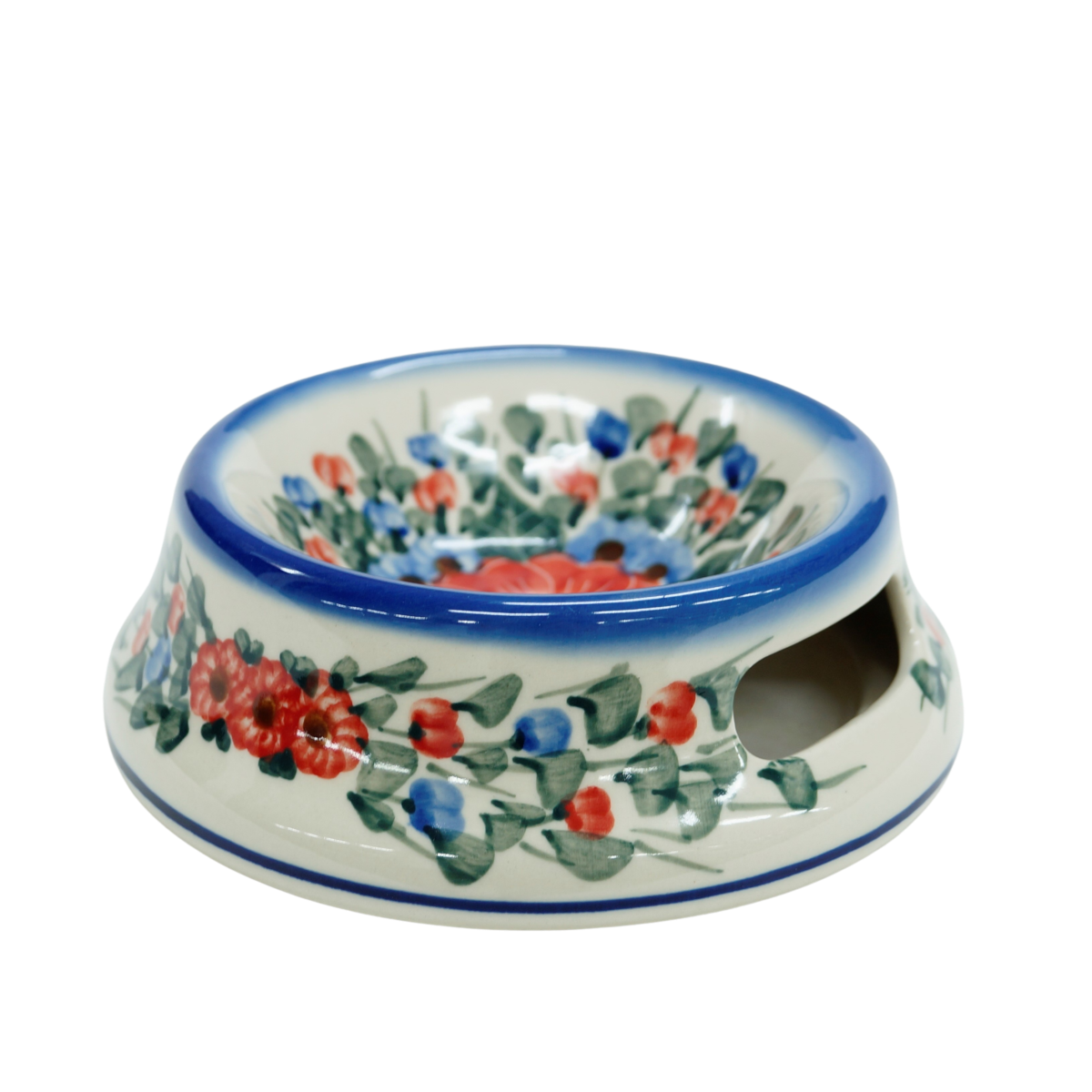 Oryginalny produkt ceramiki bolesławieckiej - miska dla psa lub kota, duża miska o średnicy 15,6 cm. Miska jest ręcznie malowana i wyprodukowana z oryginalnej kamionki bolesławieckiej. Każda dekoracja ceramiki artystycznej z naszej rodzinnej manufaktury, ANDY Ceramika, powstała z najwyższą dbałością o detale (ręcznie nakładane stempelki i z pasją malowane dekoracje kwiatowe).