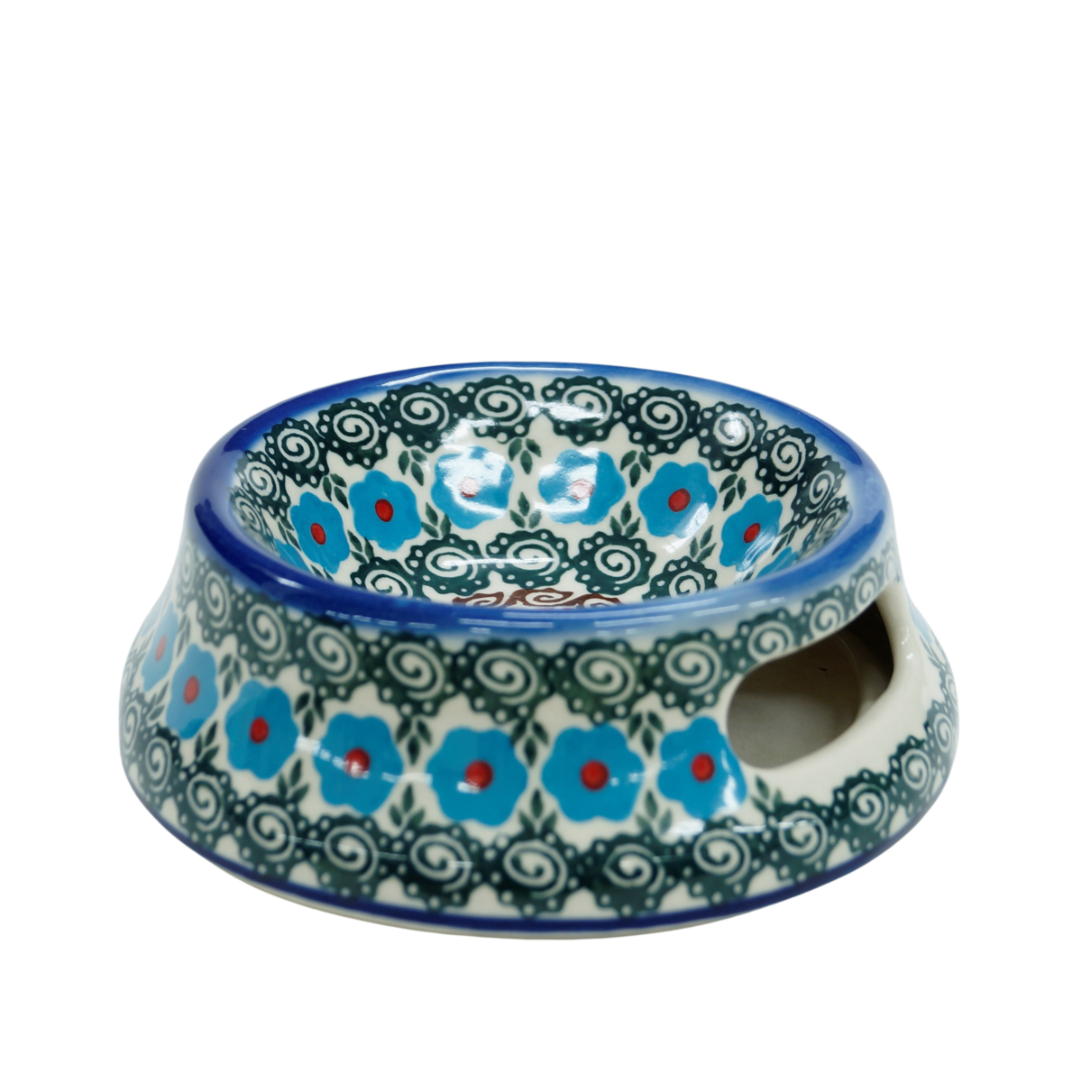Oryginalny produkt ceramiki bolesławieckiej - miska dla psa lub kota, duża miska o średnicy 15,6 cm. Miska jest ręcznie malowana i wyprodukowana z oryginalnej kamionki bolesławieckiej. Każda dekoracja ceramiki artystycznej z naszej rodzinnej manufaktury, ANDY Ceramika, powstała z najwyższą dbałością o detale (ręcznie nakładane stempelki i z pasją malowane dekoracje kwiatowe).