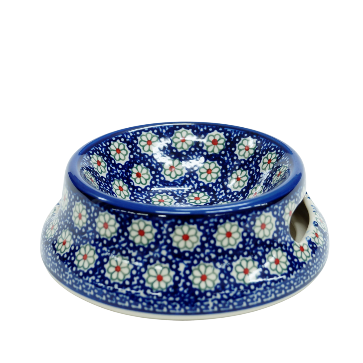 Oryginalny produkt ceramiki bolesławieckiej - miska dla psa lub kota, duża miska o średnicy 15,6 cm. Miska jest ręcznie malowana i wyprodukowana z oryginalnej kamionki bolesławieckiej. Każda dekoracja ceramiki artystycznej z naszej rodzinnej manufaktury, ANDY Ceramika, powstała z najwyższą dbałością o detale (ręcznie nakładane stempelki i z pasją malowane dekoracje kwiatowe).