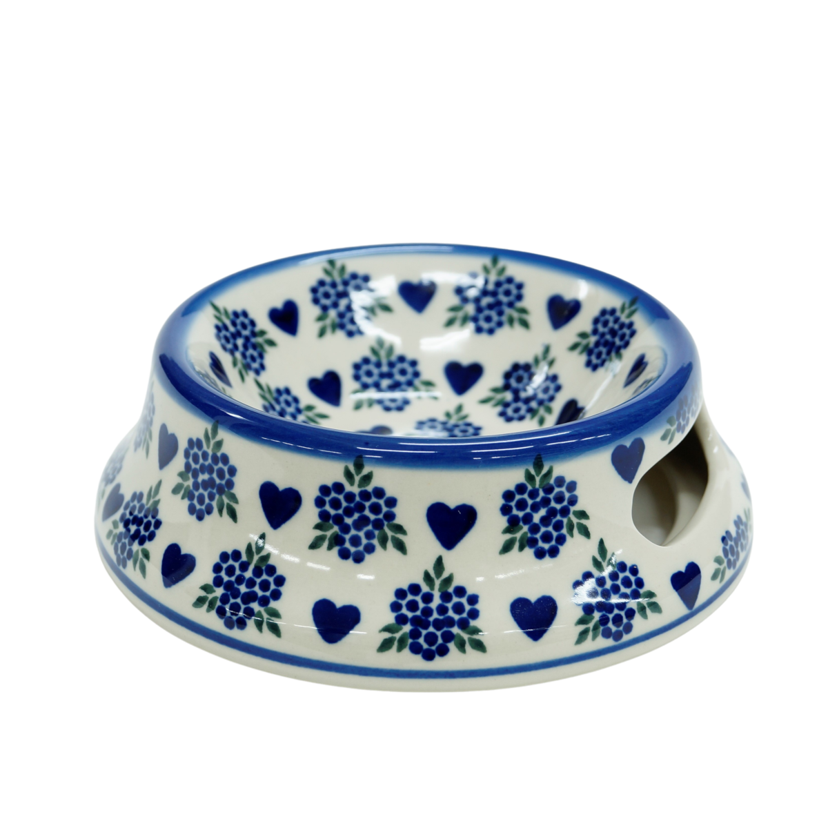 Oryginalny produkt ceramiki bolesławieckiej - miska dla psa lub kota, duża miska o średnicy 15,6 cm. Miska jest ręcznie malowana i wyprodukowana z oryginalnej kamionki bolesławieckiej. Każda dekoracja ceramiki artystycznej z naszej rodzinnej manufaktury, ANDY Ceramika, powstała z najwyższą dbałością o detale (ręcznie nakładane stempelki i z pasją malowane dekoracje kwiatowe).
