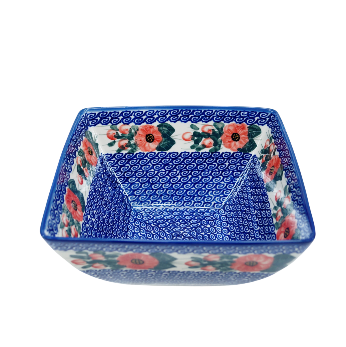 Miska kwadratowa głęboka wykonana w bolesławieckiej manufakturze ceramiki artystycznej. Miska ceramiczna o pojemności 1,9 l o oryginalnym kształcie kwadratu. Designerska forma i ręczne, tradycyjne stempelkowe zdobienia podszkliwne sprawiają, że miska wyróżnia się na stole Twojej jadalni czy blacie kuchennym. Ceramiczna miska posłuży podczas przygotowywania czy przechowywania posiłków.