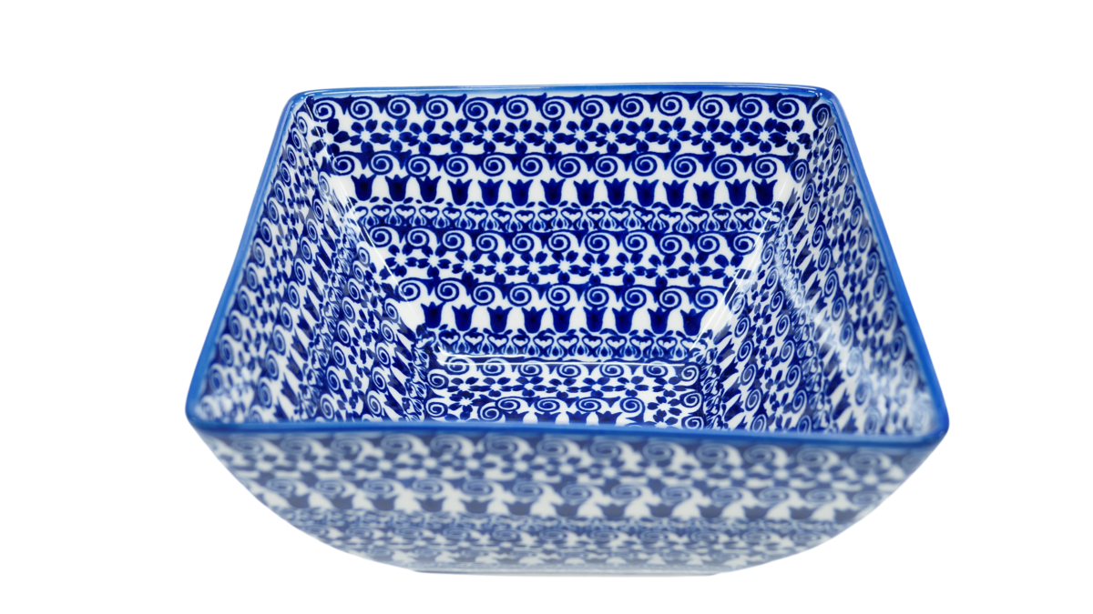 Miska kwadratowa głęboka wykonana w bolesławieckiej manufakturze ceramiki artystycznej. Miska ceramiczna o pojemności 1,9 l o oryginalnym kształcie kwadratu. Designerska forma i ręczne, tradycyjne stempelkowe zdobienia podszkliwne sprawiają, że miska wyróżnia się na stole Twojej jadalni czy blacie kuchennym. Ceramiczna miska posłuży podczas przygotowywania czy przechowywania posiłków.