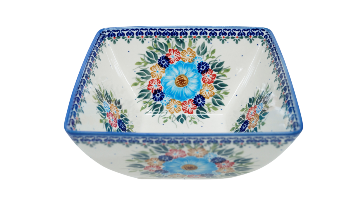Miska kwadratowa głęboka wykonana w bolesławieckiej manufakturze ceramiki artystycznej. Miska ceramiczna o pojemności 1,9 l o oryginalnym kształcie kwadratu. Designerska forma i ręczne, tradycyjne stempelkowe zdobienia podszkliwne sprawiają, że miska wyróżnia się na stole Twojej jadalni czy blacie kuchennym. Ceramiczna miska posłuży podczas przygotowywania czy przechowywania posiłków.