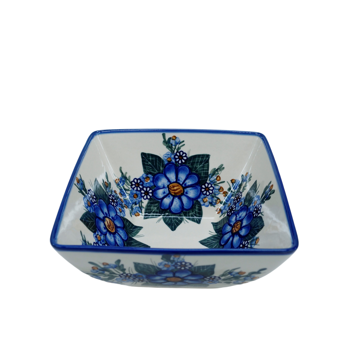 Miska kwadratowa głęboka wykonana w bolesławieckiej manufakturze ceramiki artystycznej. Miska ceramiczna o pojemności 1,9 l o oryginalnym kształcie kwadratu. Designerska forma i ręczne, tradycyjne stempelkowe zdobienia podszkliwne sprawiają, że miska wyróżnia się na stole Twojej jadalni czy blacie kuchennym. Ceramiczna miska posłuży podczas przygotowywania czy przechowywania posiłków.