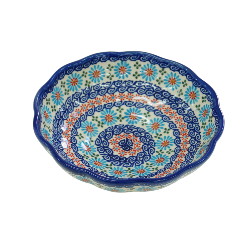 Oryginalny produkt ceramiki bolesławieckiej – miska kwiatek I, idealna do podawania i przechowywania potraw. Niech Twoja potrawa będzie podana pięknie i smakuje wykwitnie dzięki artystycznym naczyniom ceramiki Bolesławieckiej z rodzinnej manufaktury, CERAMIKA ANDY.