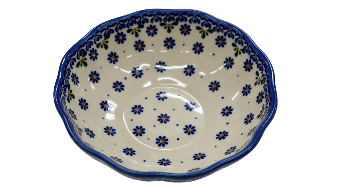 Oryginalny produkt ceramiki bolesławieckiej – miska kwiatek II, idealna do podawania i przechowywania potraw. Niech Twoja potrawa będzie podana pięknie i smakuje wykwitnie dzięki artystycznym naczyniom ceramiki Bolesławieckiej z rodzinnej manufaktury, CERAMIKA ANDY.