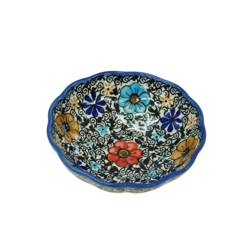 Oryginalny produkt ceramiki bolesławieckiej – miska kwiatek II, idealna do podawania i przechowywania potraw. Niech Twoja potrawa będzie podana pięknie i smakuje wykwitnie dzięki artystycznym naczyniom ceramiki Bolesławieckiej z rodzinnej manufaktury, CERAMIKA ANDY.
