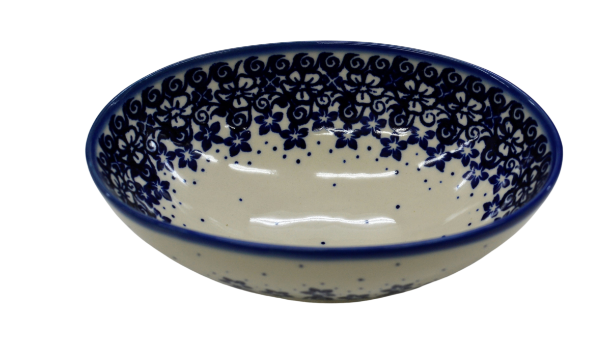 Oryginalny produkt ceramiki bolesławieckiej - ręcznie zdobiona miska ceramiczna, salaterka w kształcie jajka, idealna do podawania i przechowywania potraw. Niech wszystkie potrawy i posiłki będą podane pięknie i smakują wykwitnie dzięki artystycznym naczyniom ceramiki Bolesławieckiej z rodzinnej manufaktury, CERAMIKA ANDY.