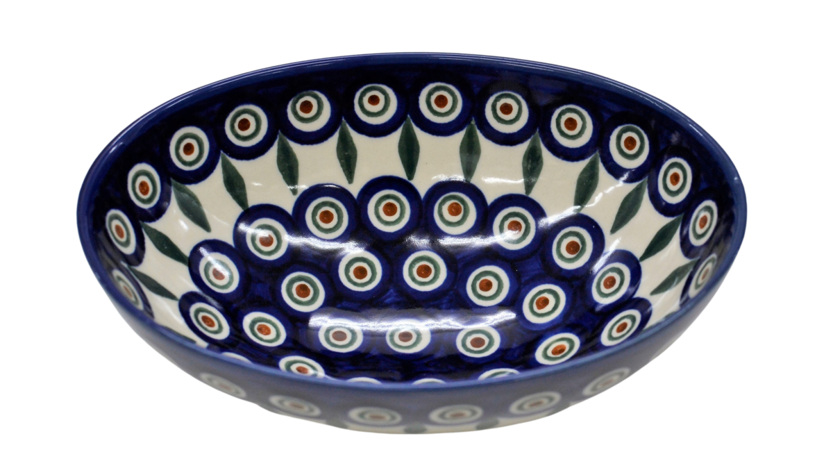 Oryginalny produkt ceramiki bolesławieckiej - ręcznie zdobiona miska ceramiczna, salaterka w kształcie jajka, idealna do podawania i przechowywania potraw. Niech wszystkie potrawy i posiłki będą podane pięknie i smakują wykwitnie dzięki artystycznym naczyniom ceramiki Bolesławieckiej z rodzinnej manufaktury, CERAMIKA ANDY.