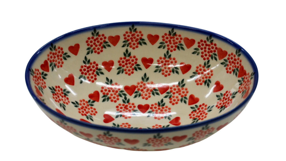 Oryginalny produkt ceramiki bolesławieckiej - ręcznie zdobiona miska ceramiczna, salaterka w kształcie jajka, idealna do podawania i przechowywania potraw. Niech wszystkie potrawy i posiłki będą podane pięknie i smakują wykwitnie dzięki artystycznym naczyniom ceramiki Bolesławieckiej z rodzinnej manufaktury, CERAMIKA ANDY.