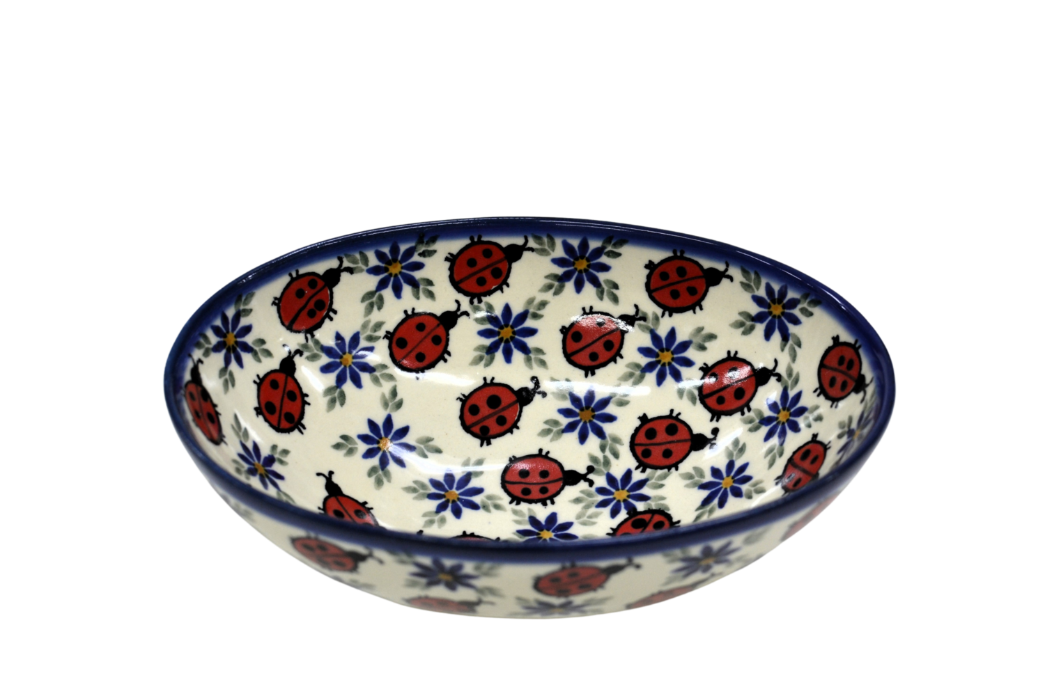 Oryginalny produkt ceramiki bolesławieckiej - ręcznie zdobiona miska ceramiczna, salaterka w kształcie jajka, idealna do podawania i przechowywania potraw. Niech wszystkie potrawy i posiłki będą podane pięknie i smakują wykwitnie dzięki artystycznym naczyniom ceramiki Bolesławieckiej z rodzinnej manufaktury, CERAMIKA ANDY.