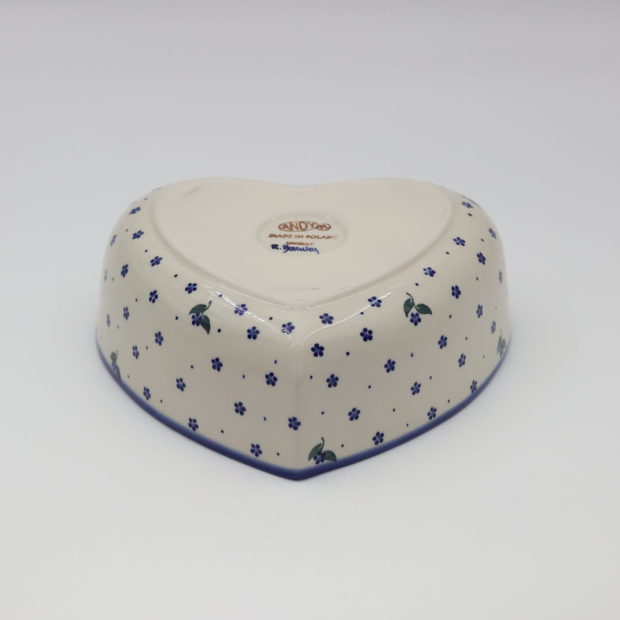 Ręcznie zdobiona kamionkowa miska o kształcie serce, idealna do podawania i przechowywania potraw. Niech Twoja potrawa przygotowana będzie podana pięknie i smakuje wykwitnie dzięki artystycznym naczyniom ceramiki Bolesławieckiej z rodzinnej manufaktury, CERAMIKA ANDY, ręcznie zdobionym podszkliwnie.
