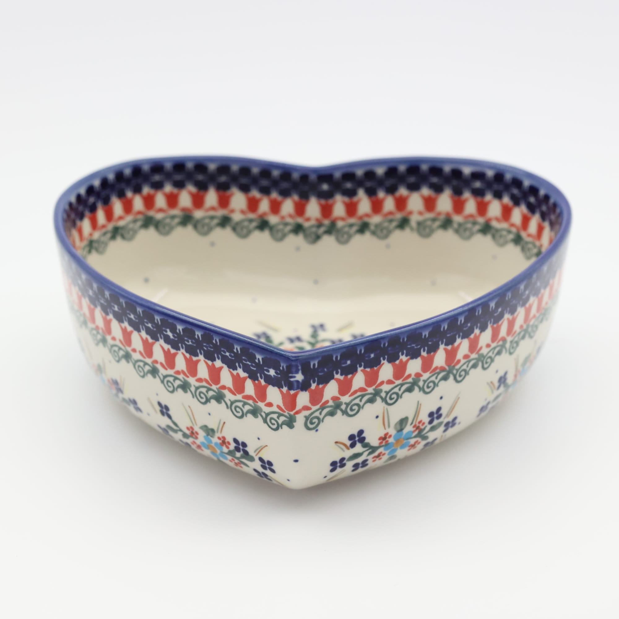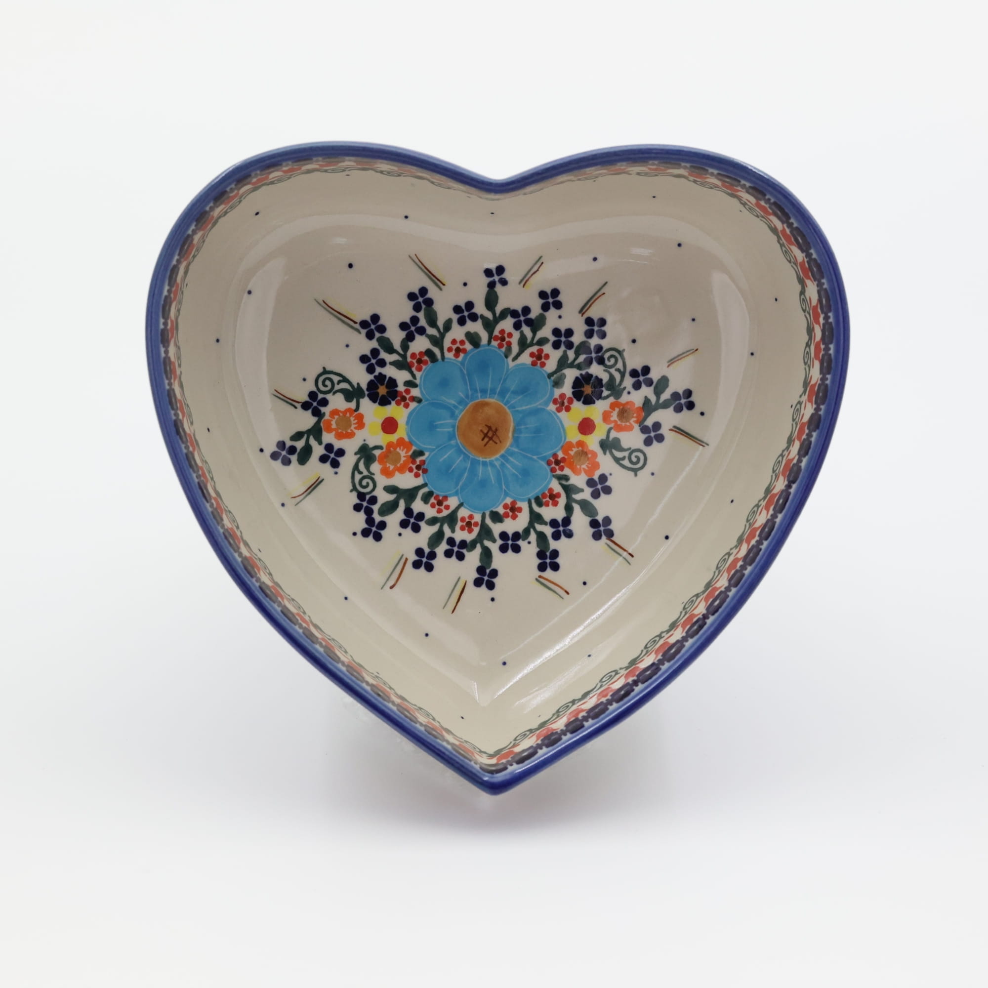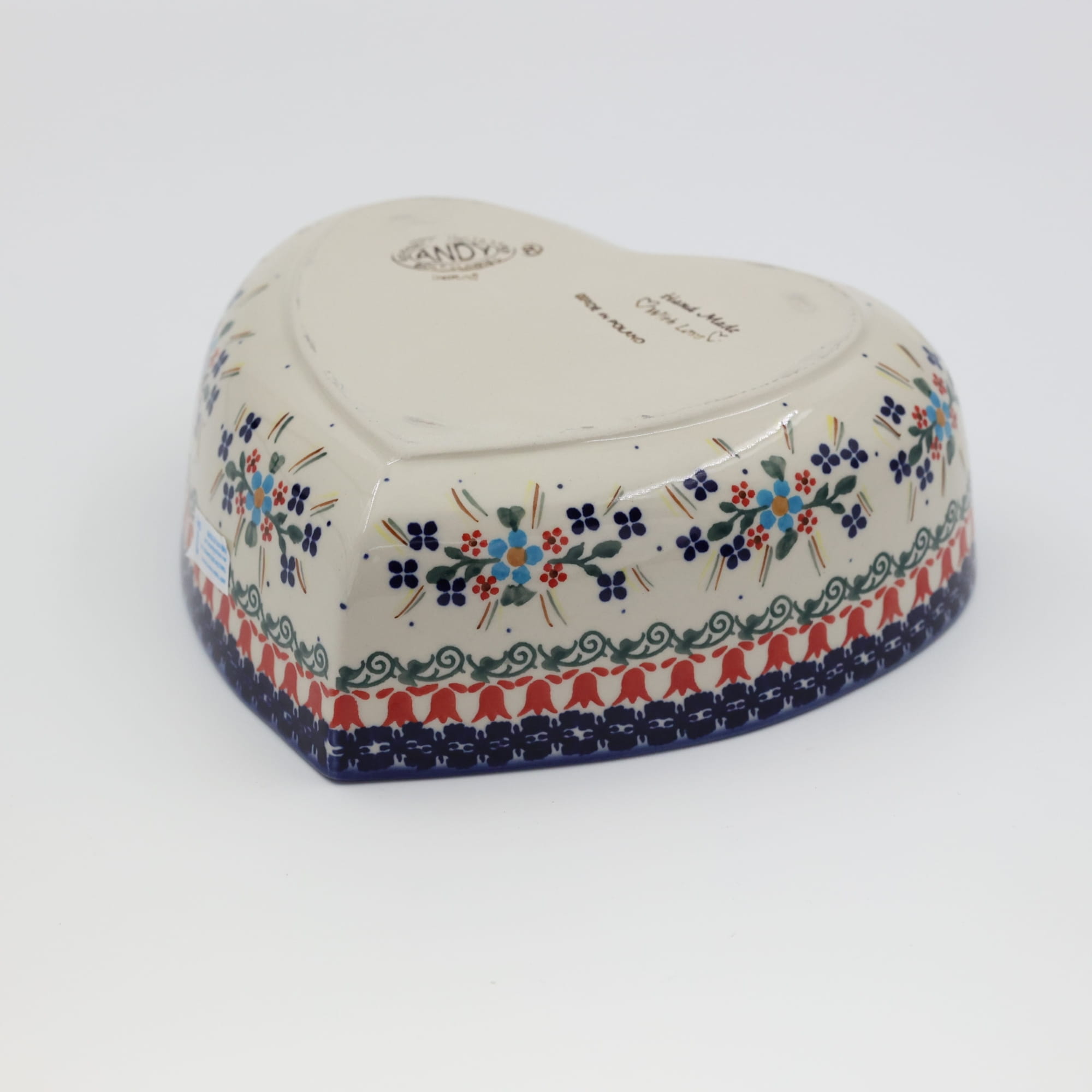 Ręcznie zdobiona kamionkowa miska o kształcie serce, idealna do podawania i przechowywania potraw. Niech Twoja potrawa przygotowana będzie podana pięknie i smakuje wykwitnie dzięki artystycznym naczyniom ceramiki Bolesławieckiej z rodzinnej manufaktury, CERAMIKA ANDY, ręcznie zdobionym podszkliwnie.