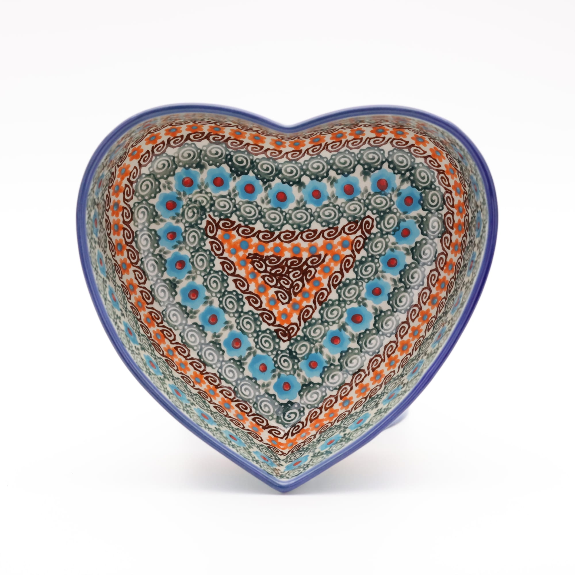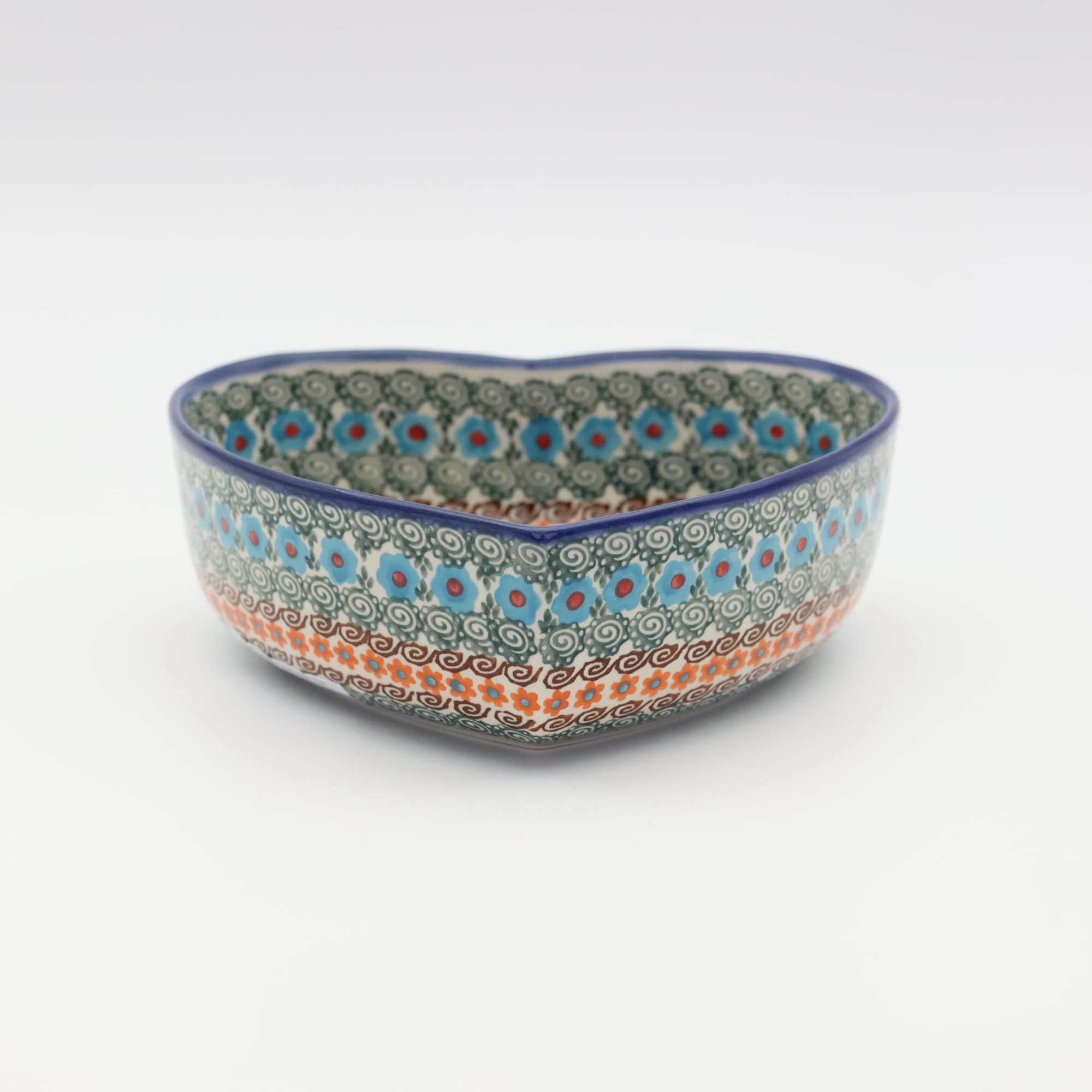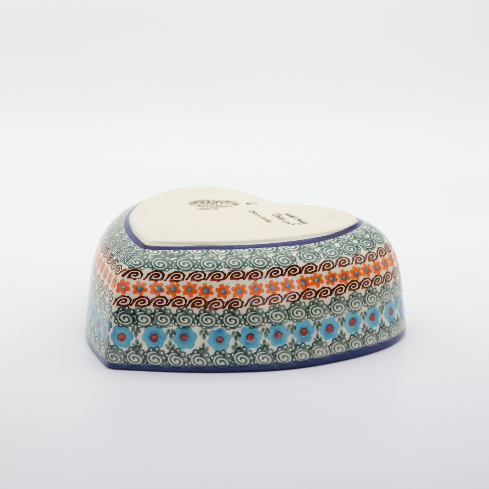 Ręcznie zdobiona kamionkowa miska o kształcie serce, idealna do podawania i przechowywania potraw. Niech Twoja potrawa przygotowana będzie podana pięknie i smakuje wykwitnie dzięki artystycznym naczyniom ceramiki Bolesławieckiej z rodzinnej manufaktury, CERAMIKA ANDY, ręcznie zdobionym podszkliwnie.