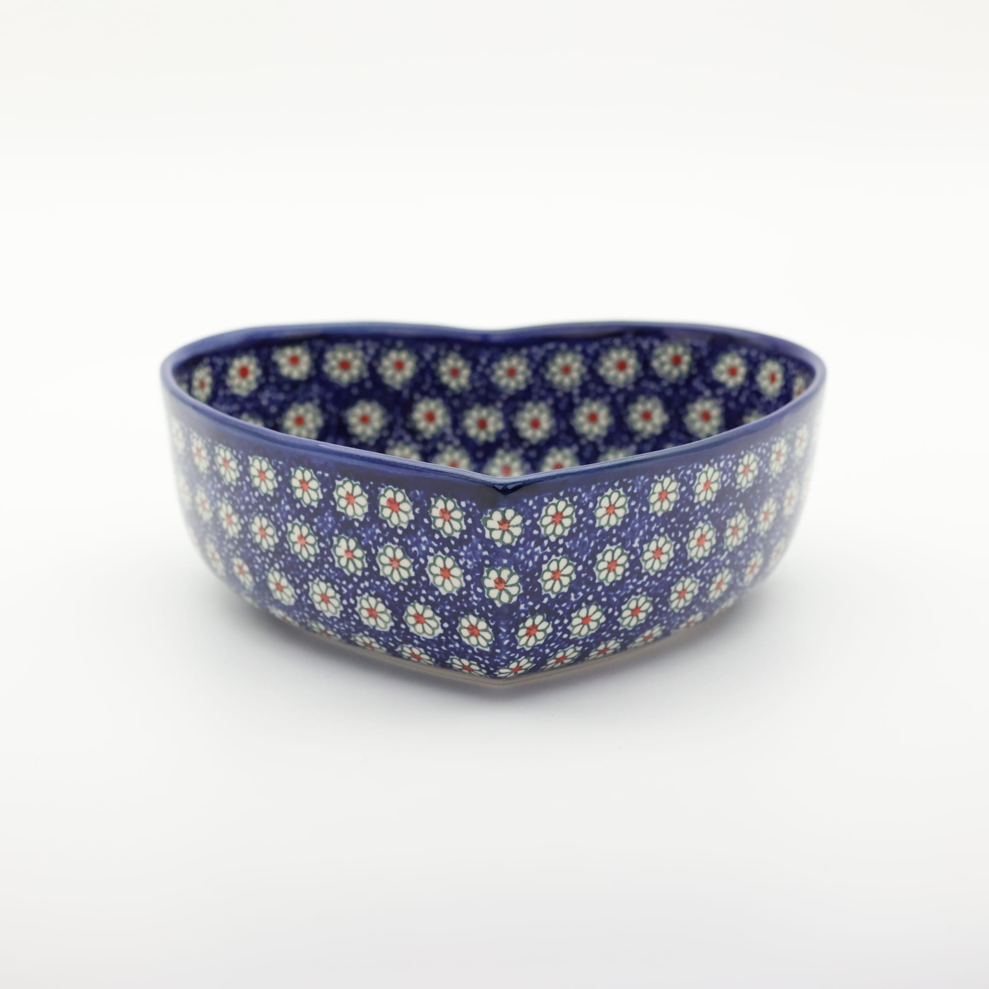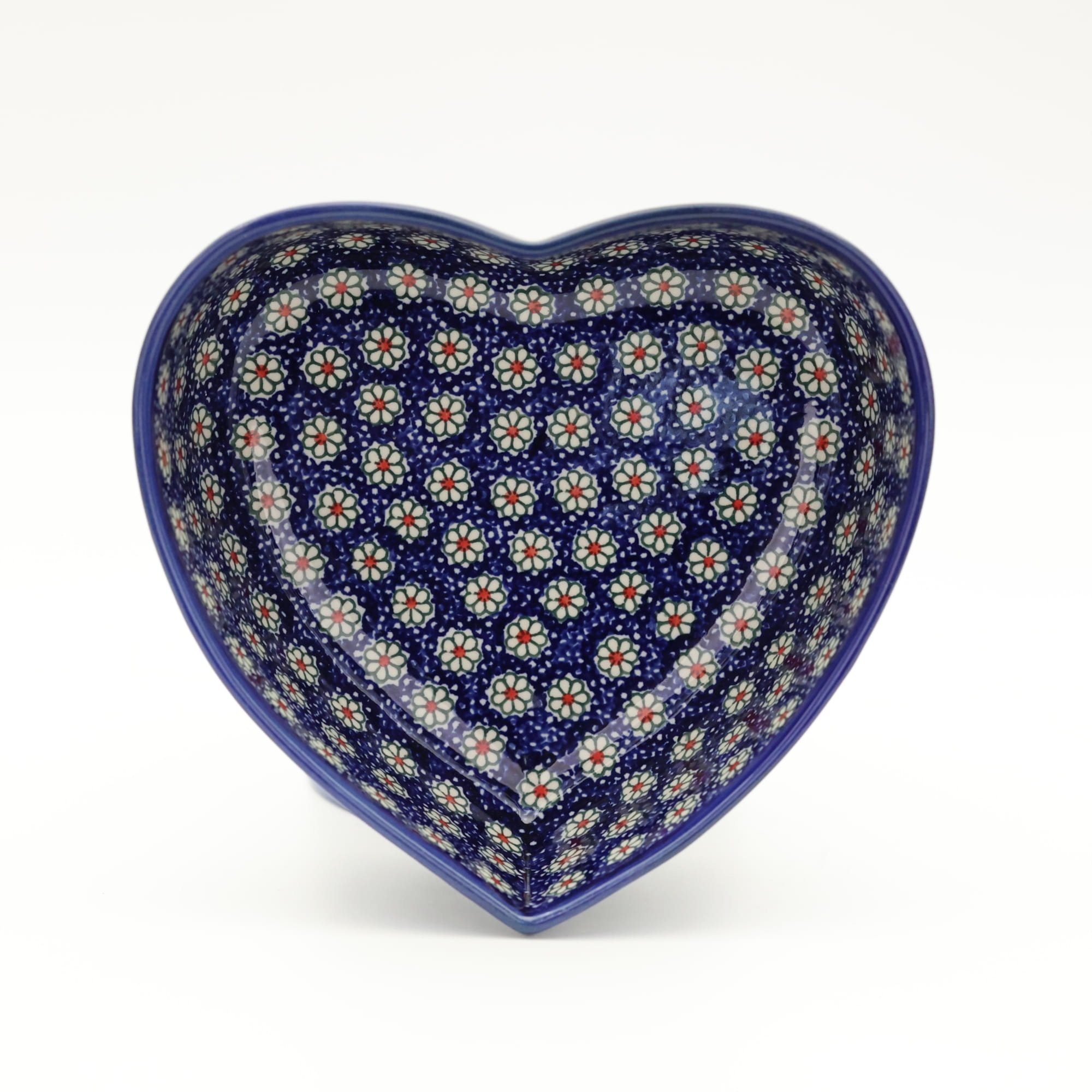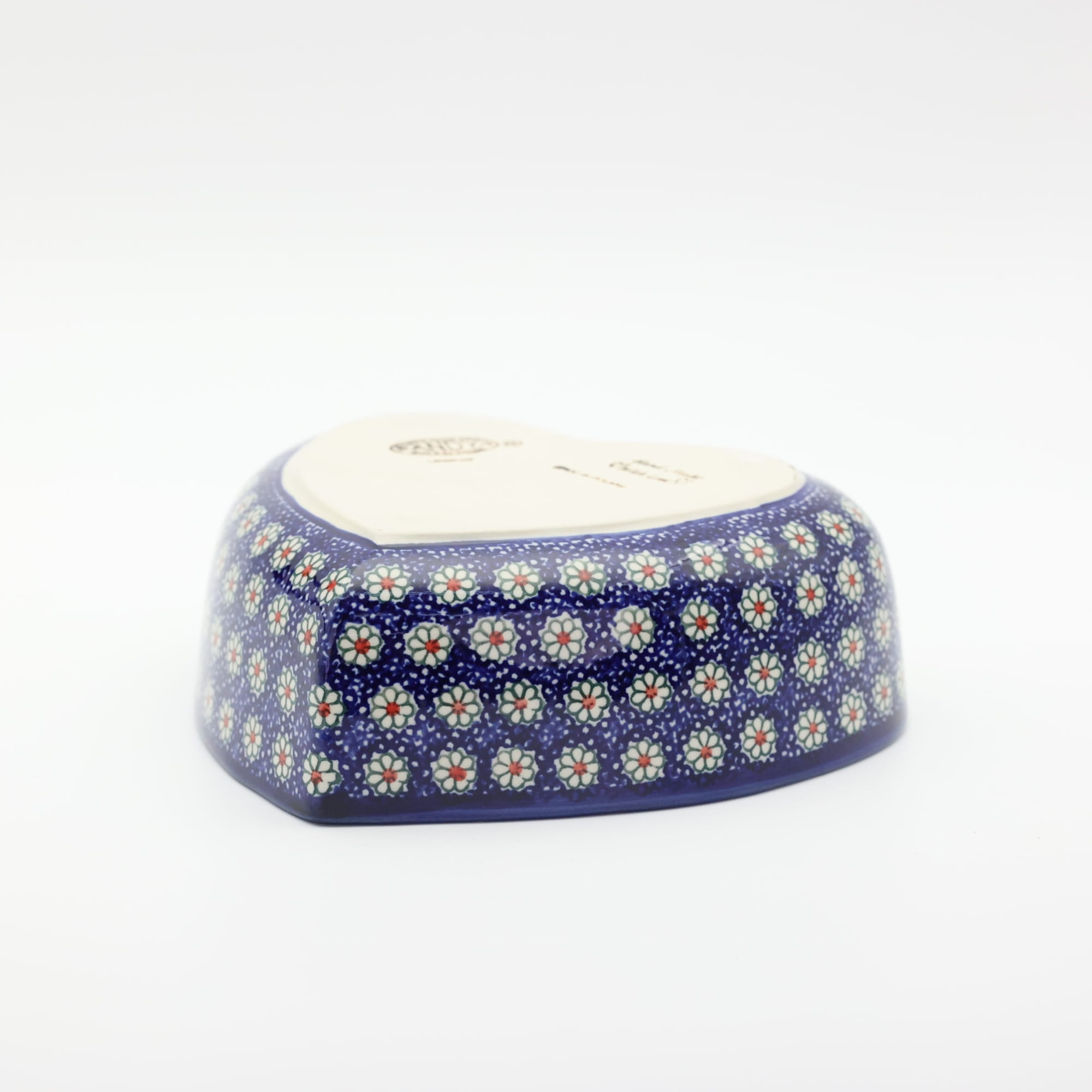 Ręcznie zdobiona kamionkowa miska o kształcie serce, idealna do podawania i przechowywania potraw. Niech Twoja potrawa przygotowana będzie podana pięknie i smakuje wykwitnie dzięki artystycznym naczyniom ceramiki Bolesławieckiej z rodzinnej manufaktury, CERAMIKA ANDY, ręcznie zdobionym podszkliwnie.