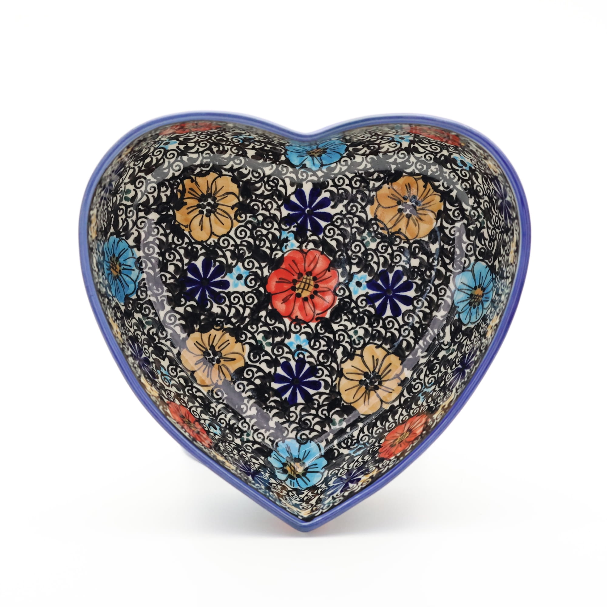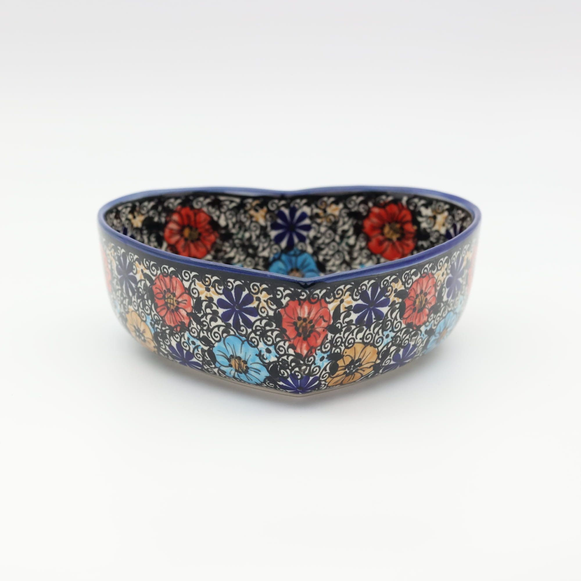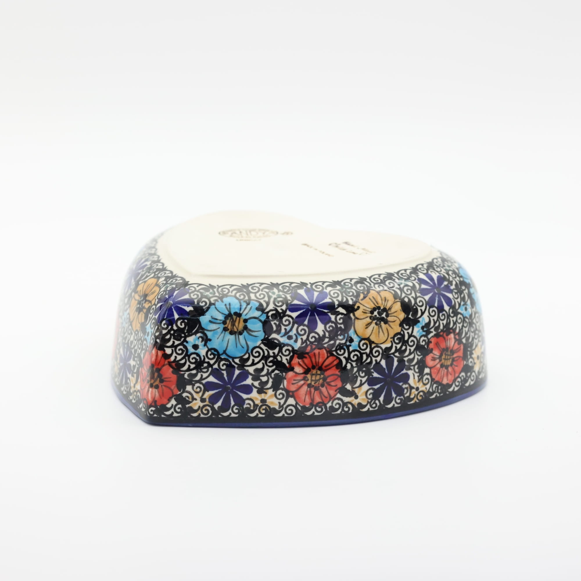 Ręcznie zdobiona kamionkowa miska o kształcie serce, idealna do podawania i przechowywania potraw. Niech Twoja potrawa przygotowana będzie podana pięknie i smakuje wykwitnie dzięki artystycznym naczyniom ceramiki Bolesławieckiej z rodzinnej manufaktury, CERAMIKA ANDY, ręcznie zdobionym podszkliwnie.