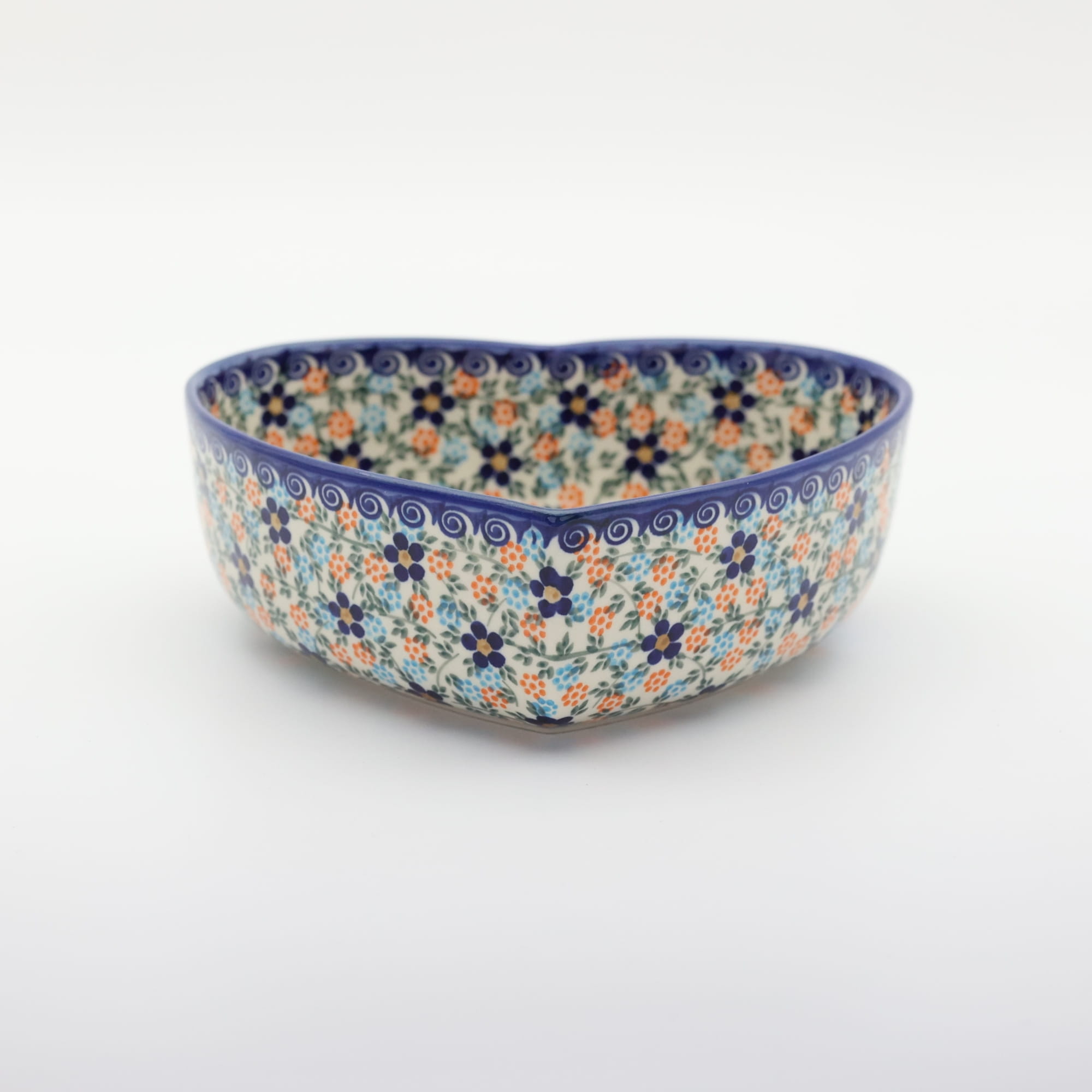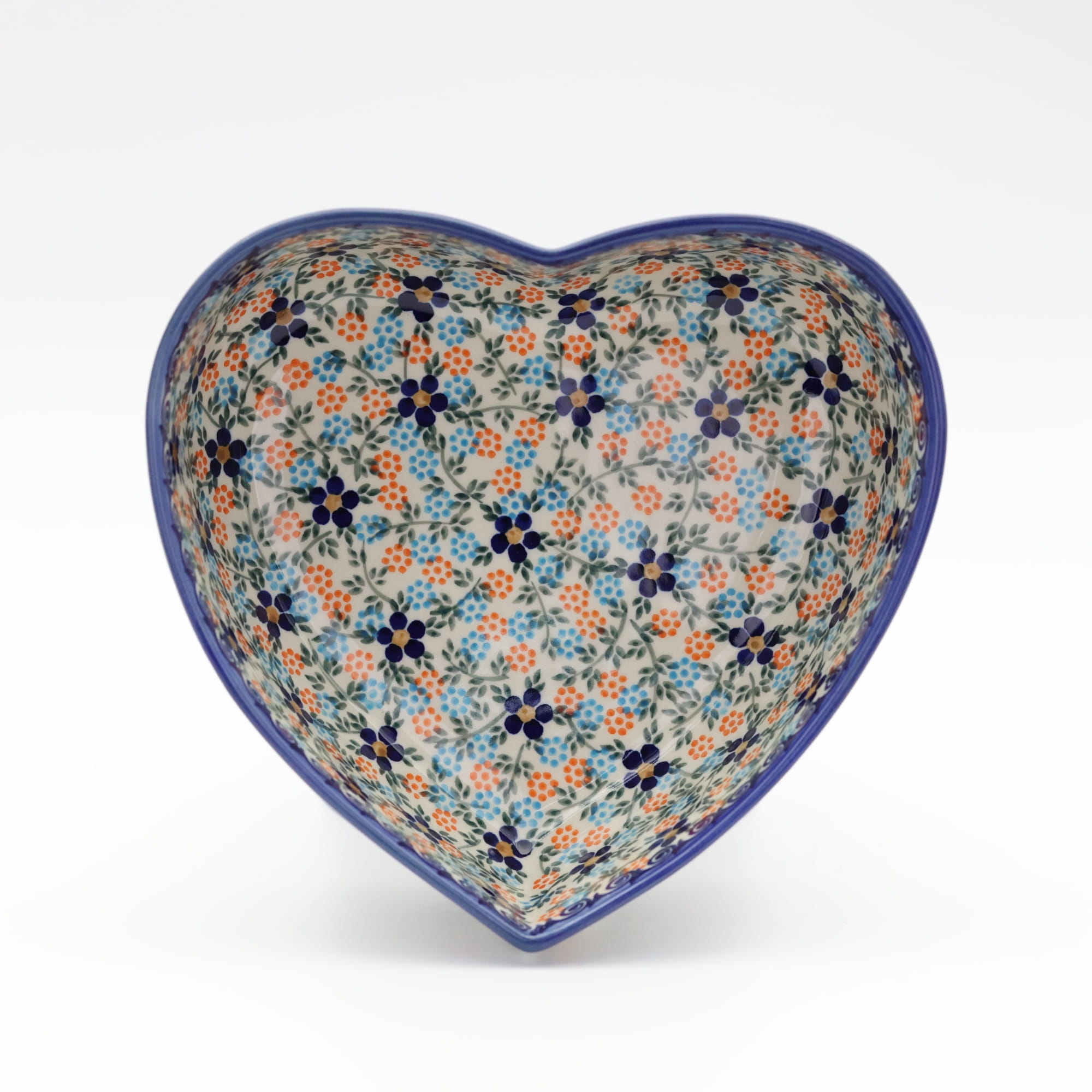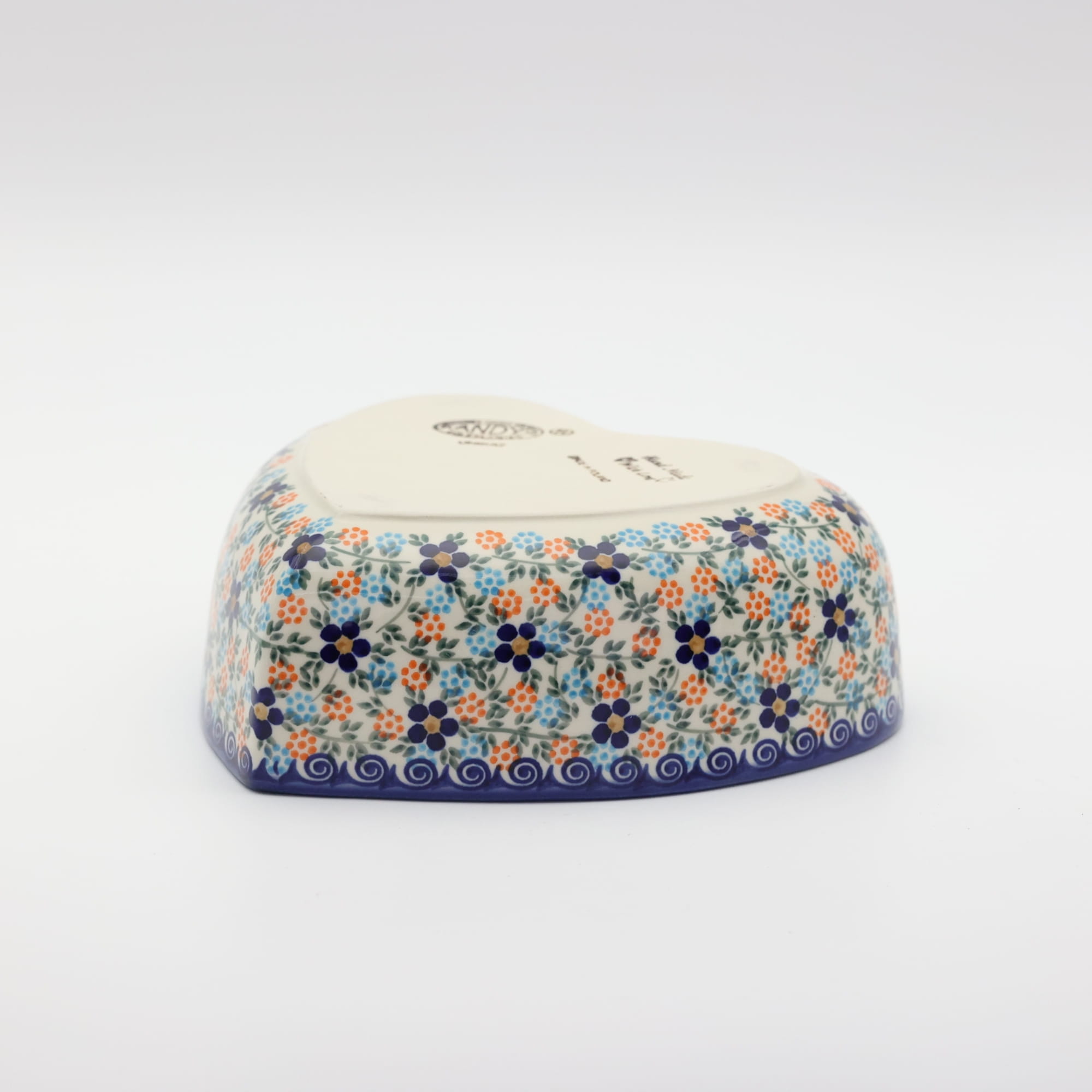 Ręcznie zdobiona kamionkowa miska o kształcie serce, idealna do podawania i przechowywania potraw. Niech Twoja potrawa przygotowana będzie podana pięknie i smakuje wykwitnie dzięki artystycznym naczyniom ceramiki Bolesławieckiej z rodzinnej manufaktury, CERAMIKA ANDY, ręcznie zdobionym podszkliwnie.