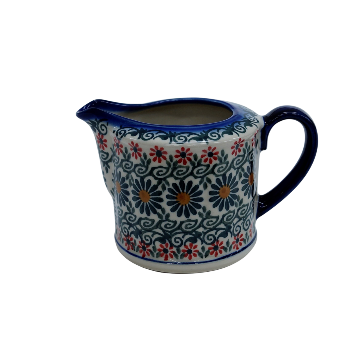Mlecznik ceramiczny ręcznie malowany o pojemności 200 ml, z uchem do wygodnego przenoszenia i dziubkiem do łatwego nalewania mleka.