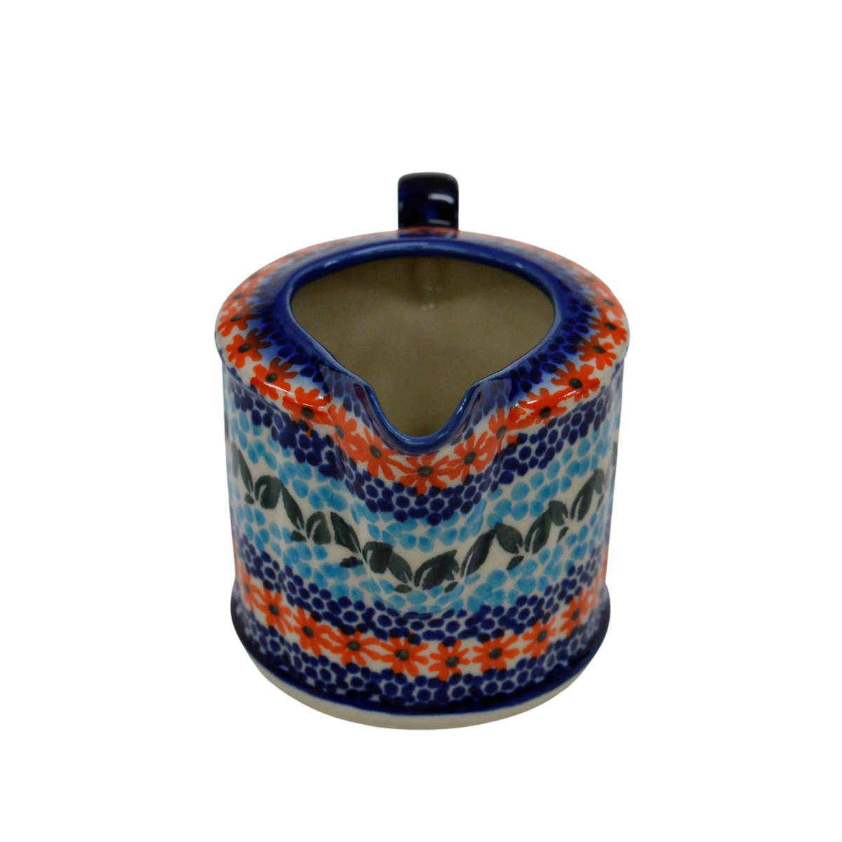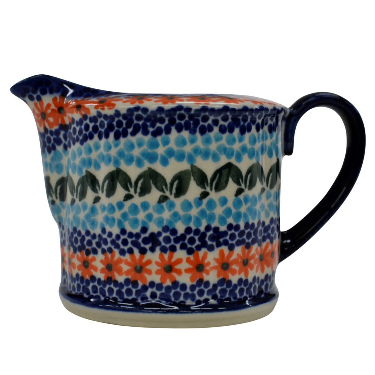 Mlecznik ceramiczny ręcznie malowany o pojemności 200 ml, z uchem do wygodnego przenoszenia i dziubkiem do łatwego nalewania mleka.